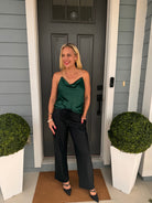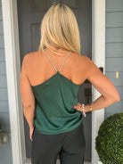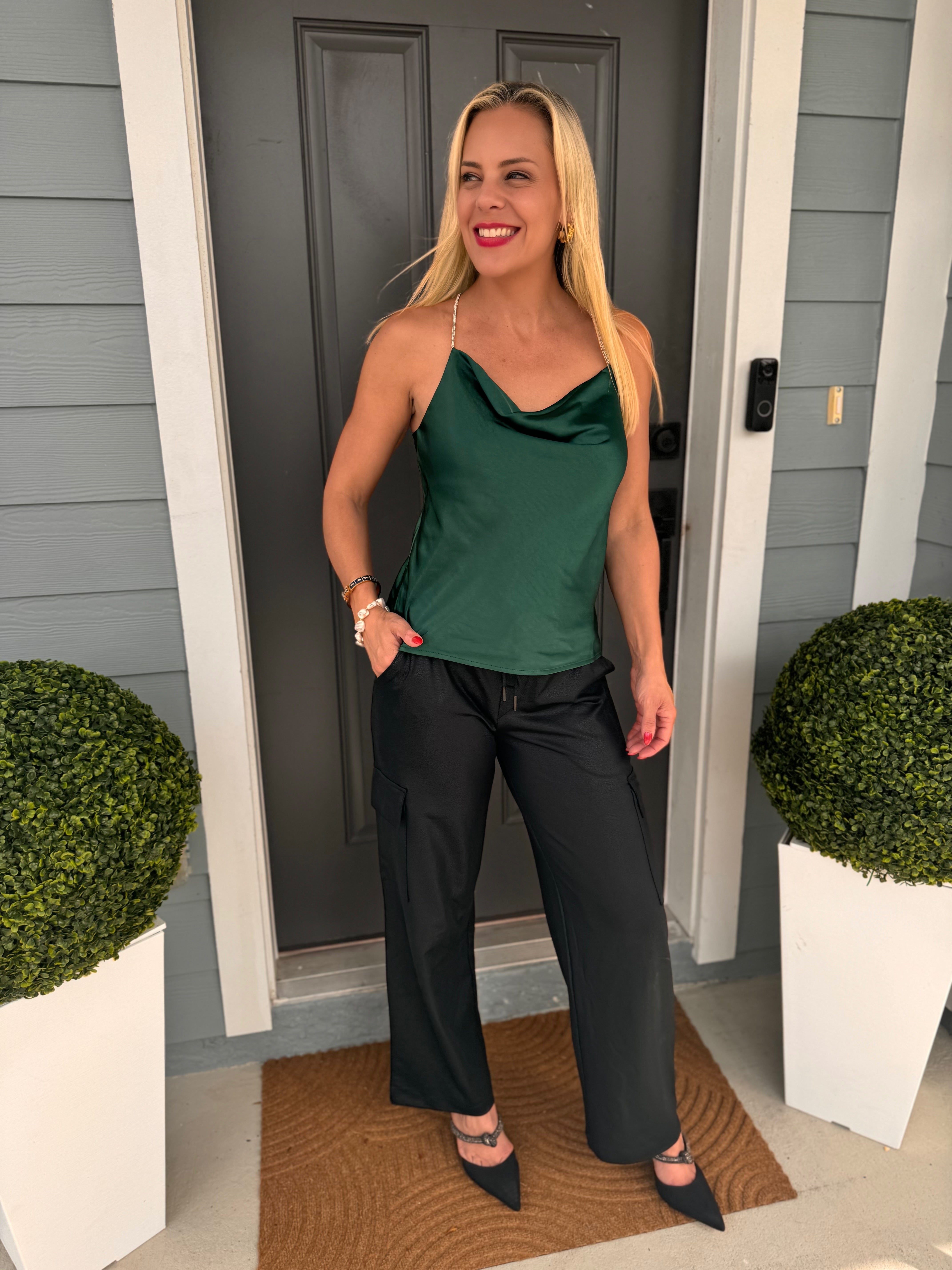 This satin, cowl-neck cami is made with silver jeweled straps. The back shows off a beautiful and elegant halter design. We love the length that can easily be tucked in to show off your waistline, but also looks stunning left untucked. This top is a MUST!
