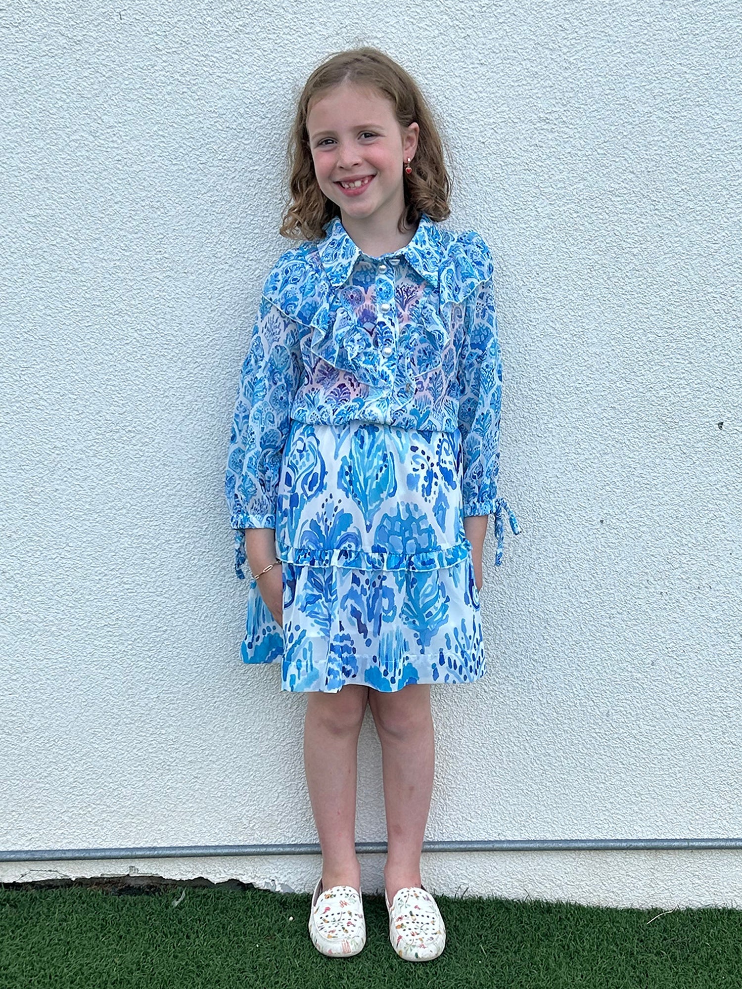 •LOOK: A pretty top from Kids Basic in a sheer chiffon print. Soft fabric. The bold buttons are faux pearls. There is a beautiful ruffle from each shoulder diagonally meeting the placket. The sleeves finish with a soft elastic and fun tie. This top may be worn to any event, daytime or evening. You probably have a perfect skirt to wear this with, but it looks dynamite with the matching skirt, also available at Pink Orchid. Pointed collar.