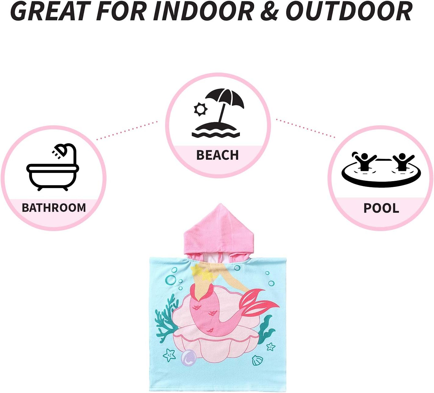 - PULLOVER DESIGN: Easy to put on& off, and will not slide down from body. Snaps: offering closer and warmer. Hooded: add comfort, making it possible to dry body& hair all at once