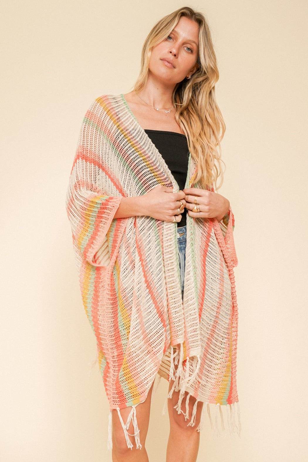 This light weight, open knit kimono is the perfect cover up! Over a tank top on a chill night, or thrown over a bathing suit for some coverage, this piece is ideal for wherever your summer takes you!