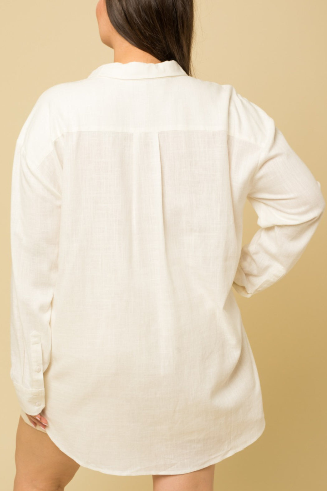 Perfect linen blend, spring shacket. Wear it as a jacket, layered over a tee or one of our Erin Tanks or wear it closed as a shirt with a pair of our Ruffle Hem Pants. Refer to measurements for your perfect fit. Model is wearing a size 1X. Across chest measurements; 1X 25”, 2X 26”, 3X 27". Shoulder to hem; Across chest measurements; 1X 28.75”, 2X 29.25”, 3X 29.75".