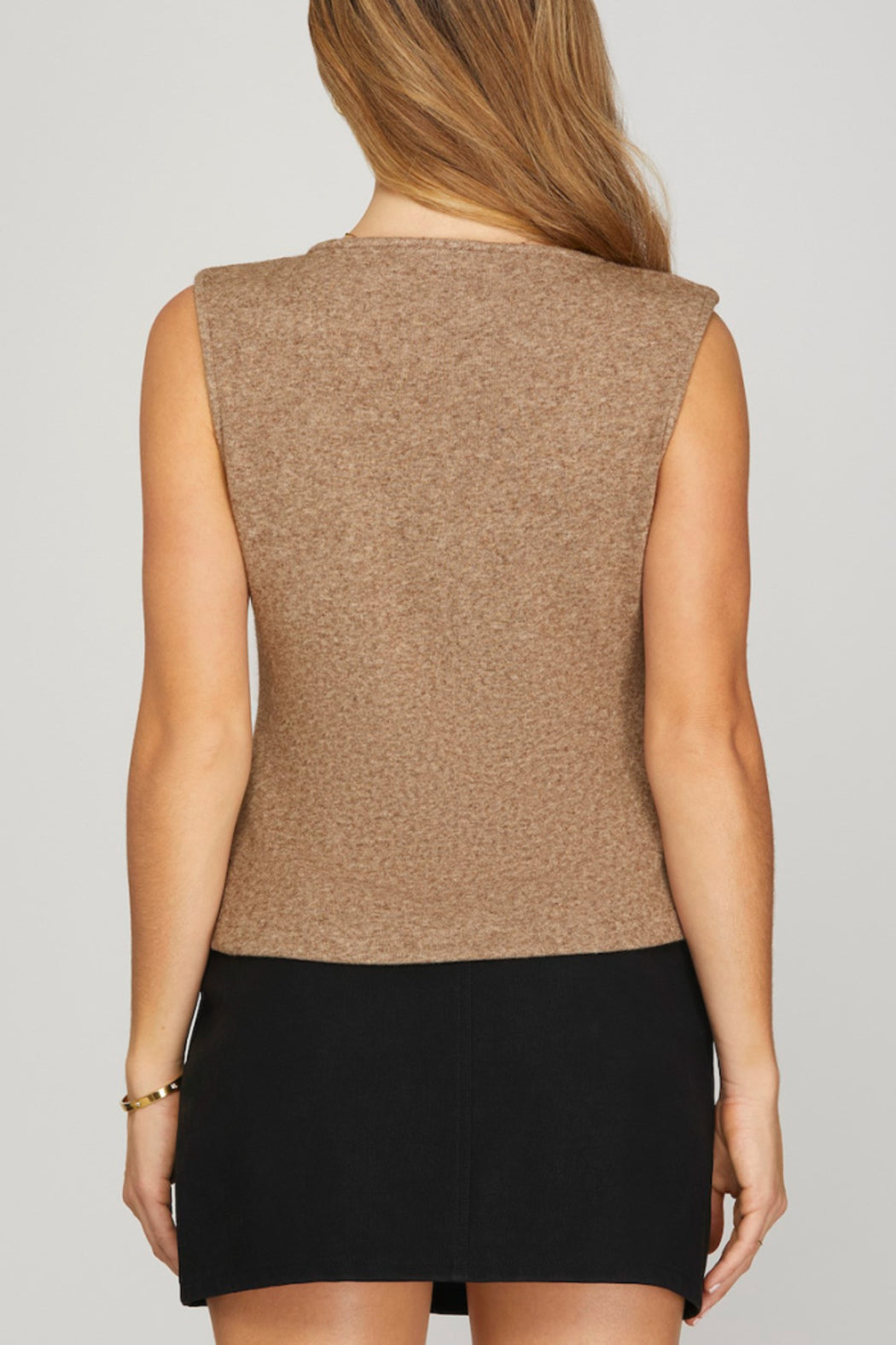 Stylish, knit vest with gold button front. Fabric has some stretch. Model is wearing a size small. Refer to measurements for your perfect fit. Small: 16" Across chest measurements, 22.5" Shoulder to hem. Medium: 17" Across chest measurements, 22.75" Shoulder to hem. Large: 18" Across chest measurements, 24" Shoulder to hem. Fabric Contents 48% Rayon 26%Polyester 21% Nylon 5% Acrylic