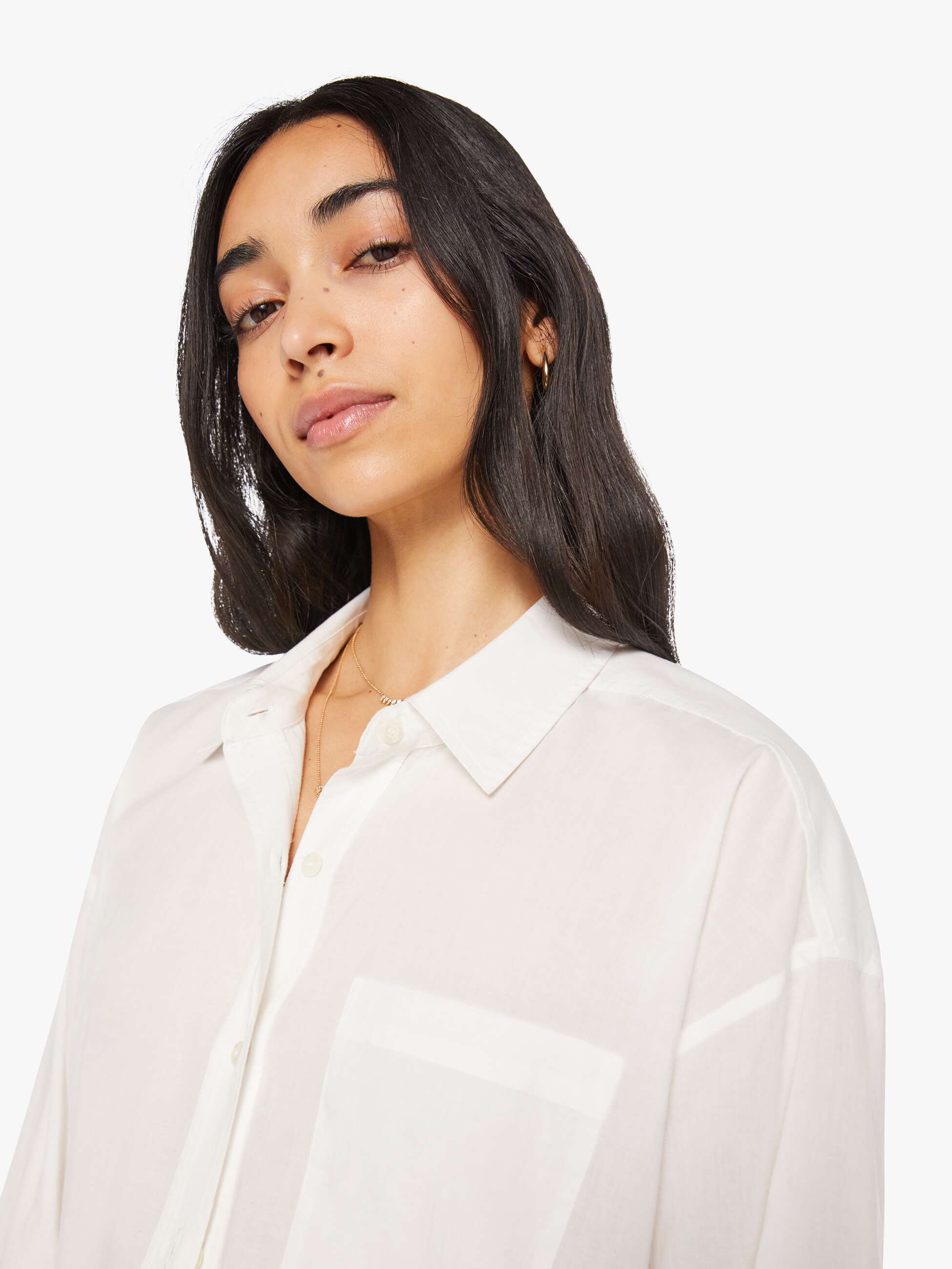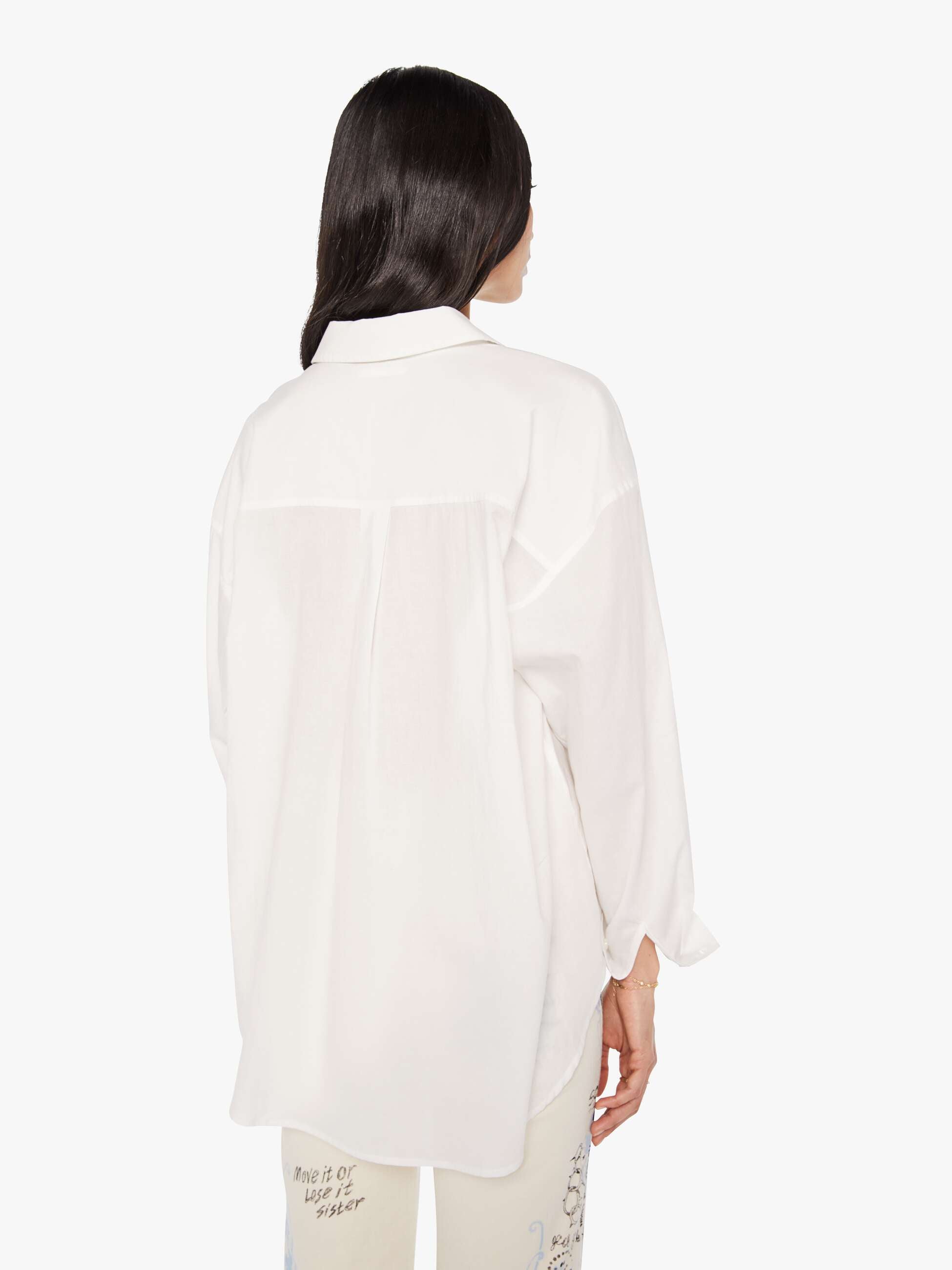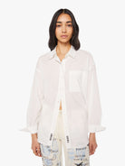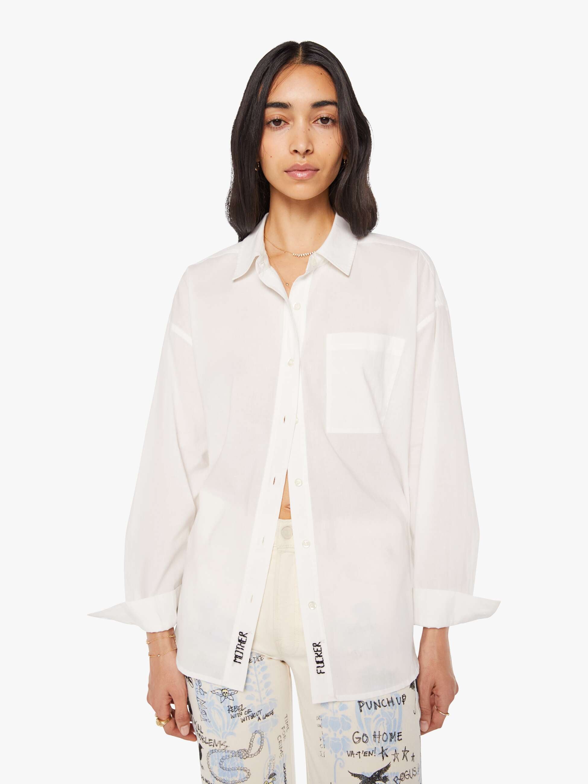 Discover the details hidden in plain sight. This timeless button-up features relaxed drop shoulders, a roomy chest patch pocket, and a gracefully curved hem. Crafted from 100% white cotton, it boldly displays "MOTHER FUCKER" embroidered in black along the button band for a cheeky twist.