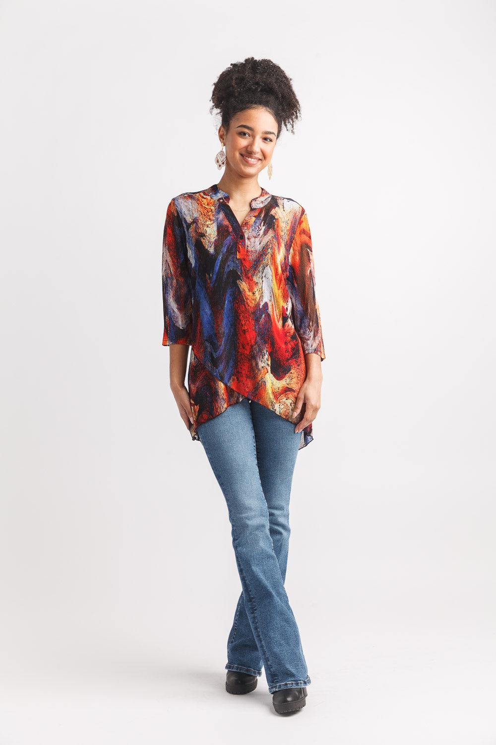 This top has a mesh look and would look good with any colour tank top. It falls longer in the back and has a shorter crossover look.
