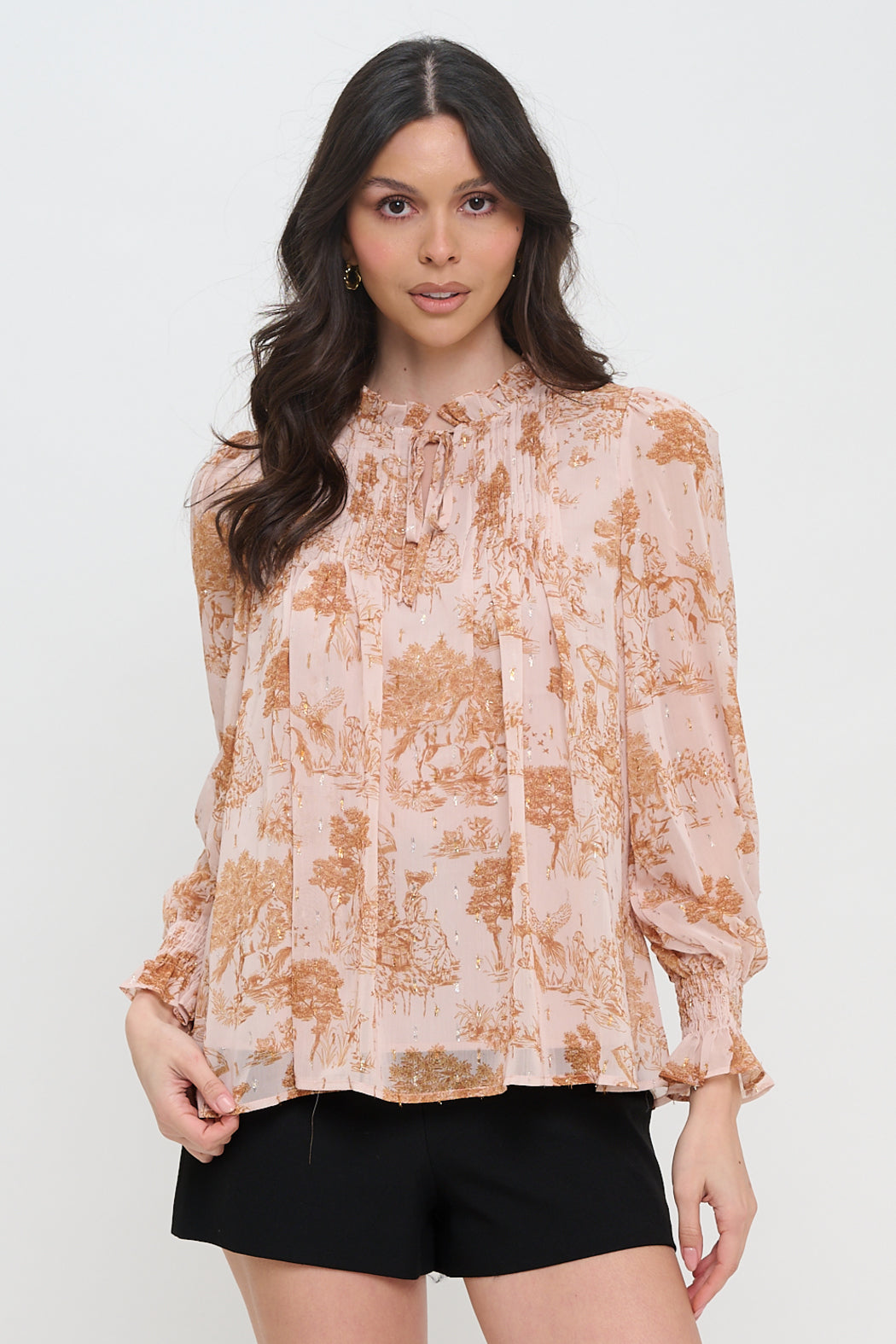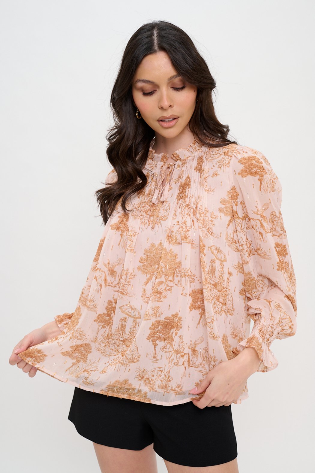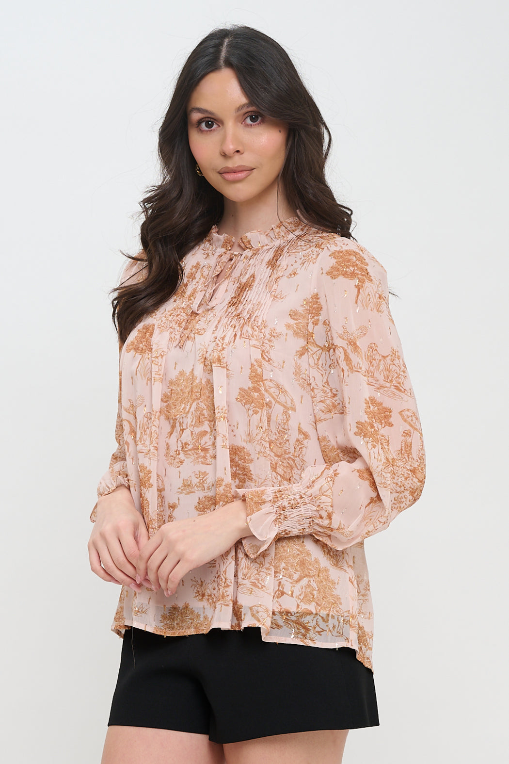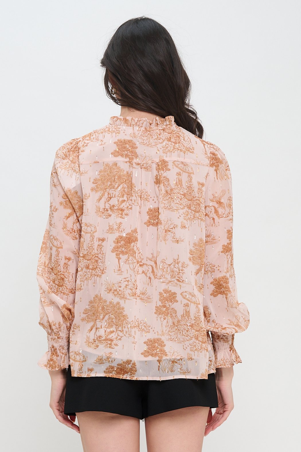 Ethereal and romantic, the Phaedra's Garden Long Sleeve Blouse captures the essence of timeless elegance. Crafted from airy chiffon with an intricate pastoral print and delicate metallic accents, this blouse features a soft ruffle neckline with a tie keyhole detail for a touch of feminine charm. Gentle shirring along the yoke adds texture, while the long sleeves finish with smocked cuffs and ruffled edges for a refined flourish. The relaxed fit drapes beautifully, making it ideal for pairing with tailored trousers for the office or with denim for a more casual yet polished look. Perfect for days when you want to feel effortlessly graceful, it’s a piece that transitions seamlessly from day to night.