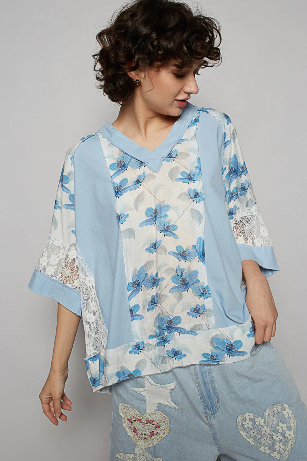 Designed in overlay V-neck, raglan short sleeve, oversized fit top in woven with raw edge detail pointed floral pattern. 100% Cotton