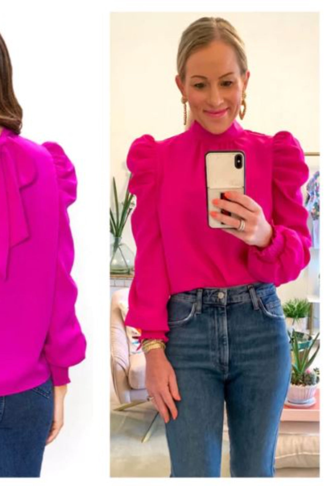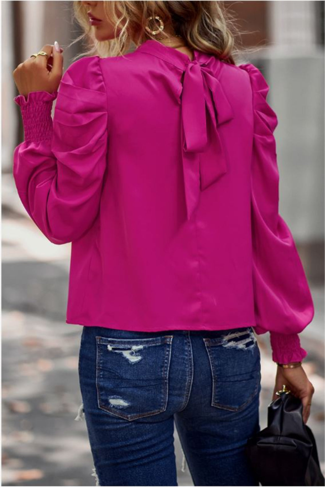 Magenta Puff Sleeve Mock Neck Top with Smocked Sleeves & Bow Back