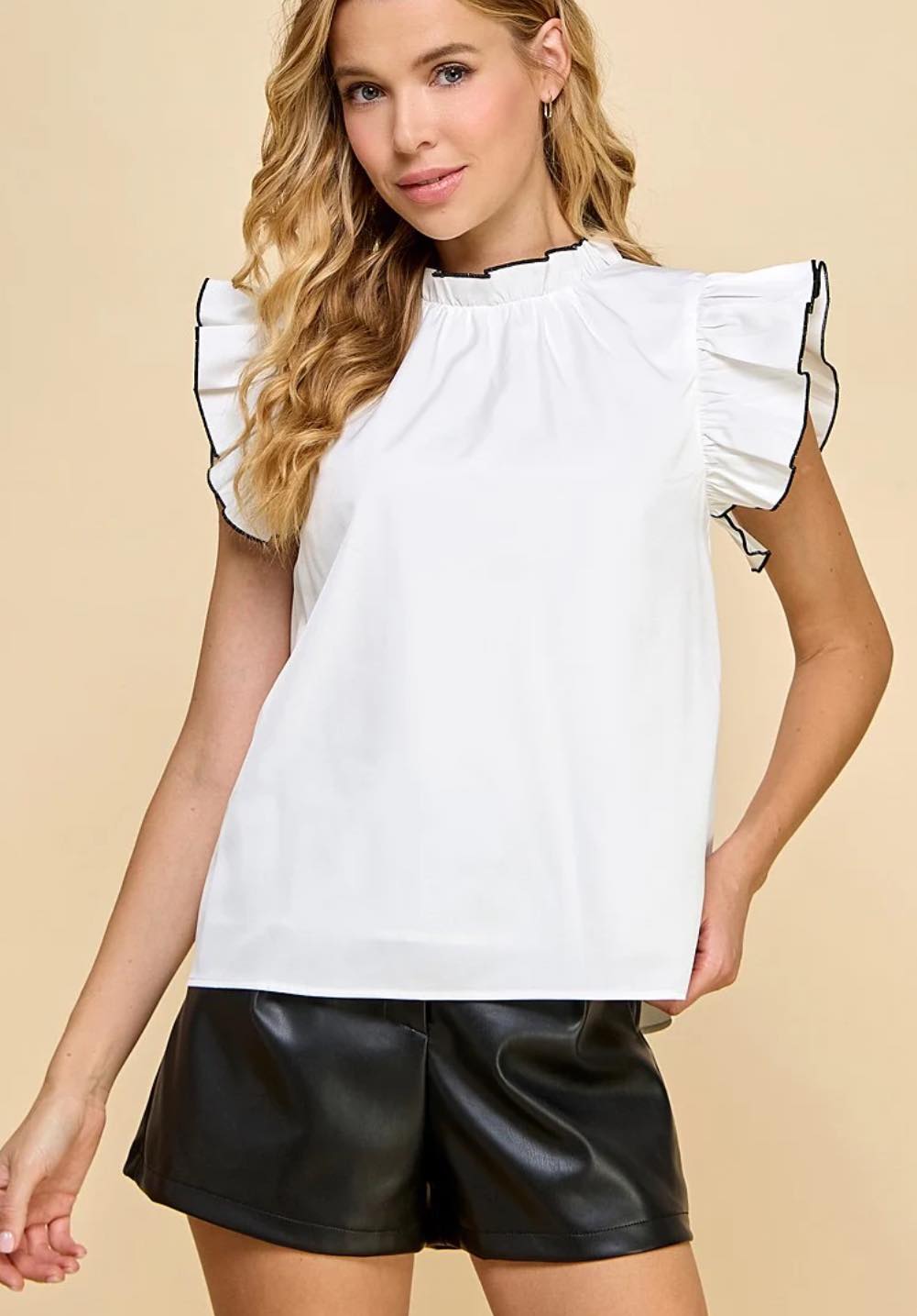 You'll be ready for almost anything in this beautiful TCEC white blouse with black trim! Featuring ultra light fabrication, back keyhole and ruffle neckline/sleeve detail.
