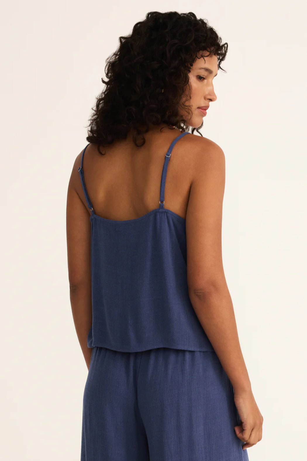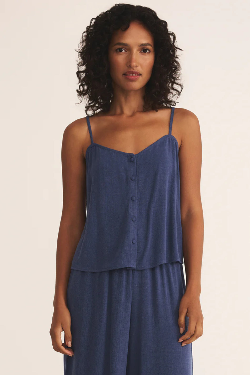 Crafted from airy linen with a novelty textured stripe, this v-neck tank brings a fresh take on warm-weather style. Finished with a button front, straight back, and adjustable o-ring straps, it’s relaxed, breathable, and made to move with you.