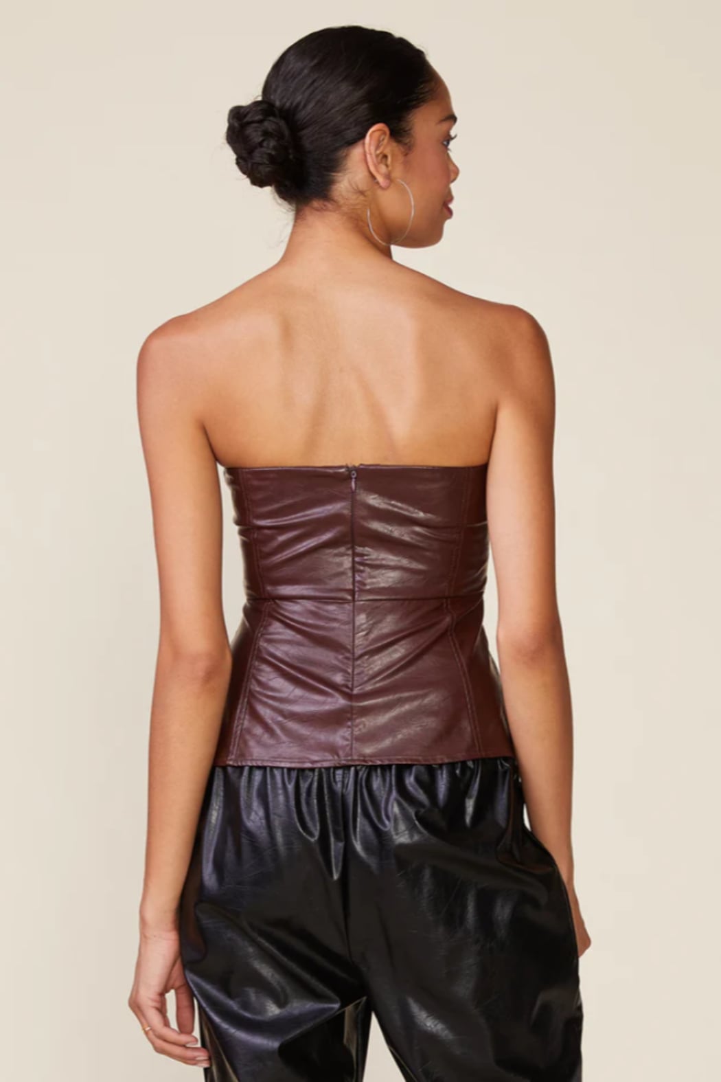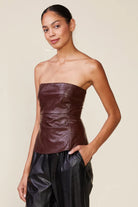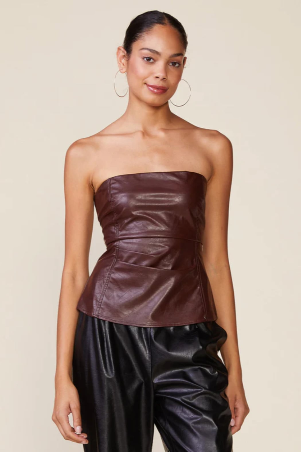 This chic, stand-out strapless top in crinkle faux leather is a number one stunner this holiday season. This style features a slightly elongated bodice with princess seams and an invisible back zip. Styling options are endless for this layer able faux leather top.