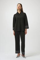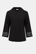 This scuba jersey top showcases a classic straight silhouette highlighted by a beautiful wrapped shawl collar that adds a polished feel. Three-quarter sleeves with subtle embellishments bring understated glamour to this design.