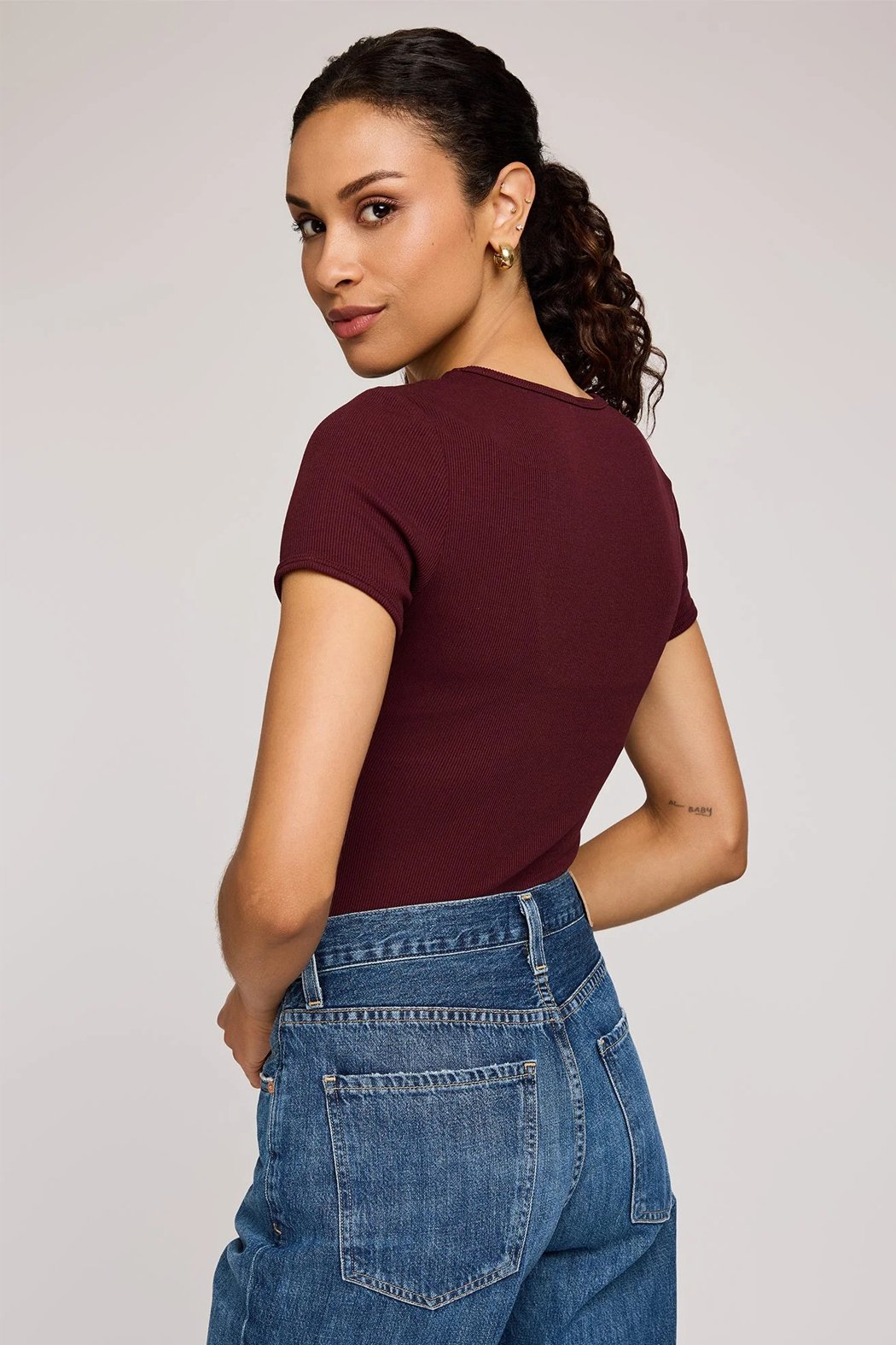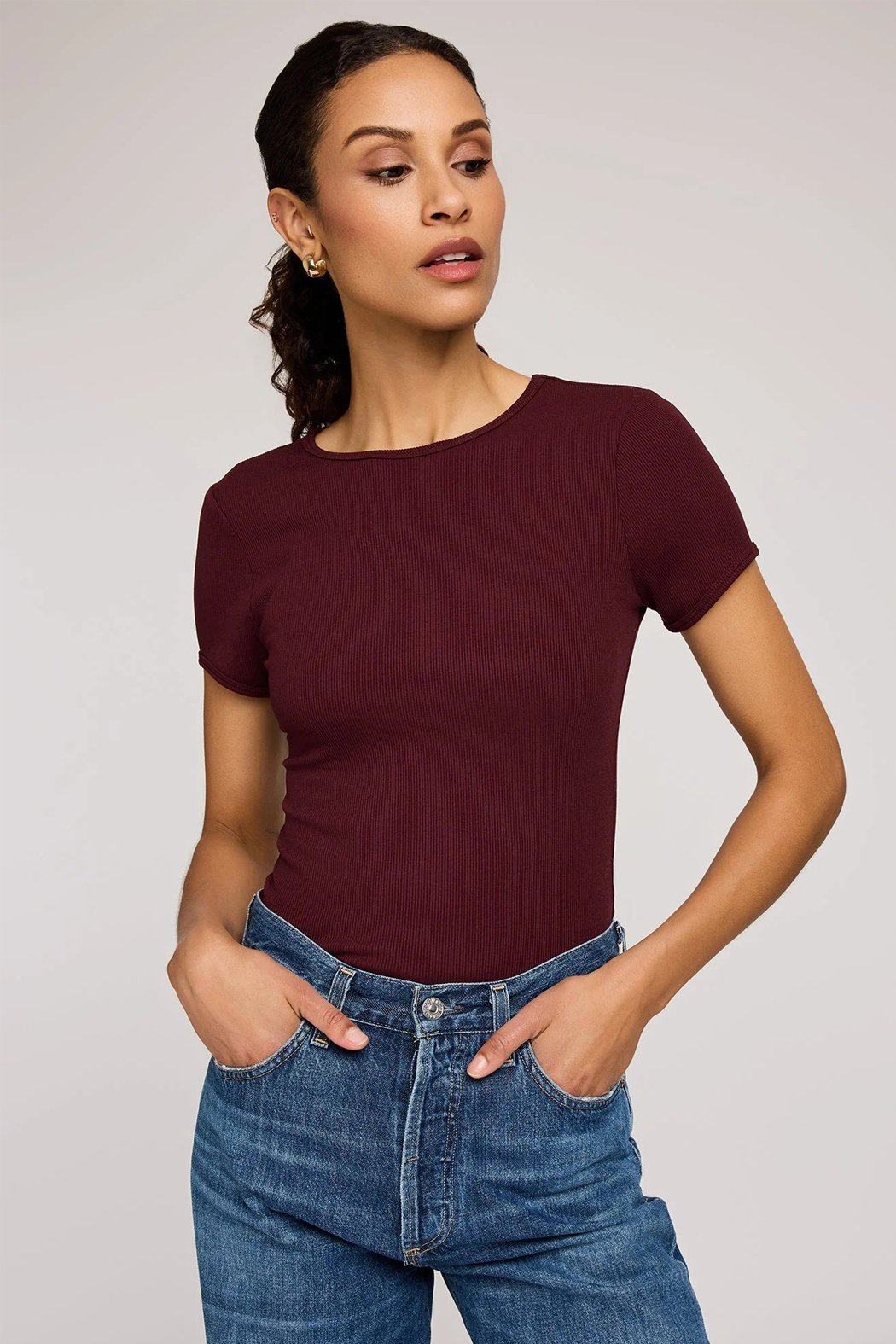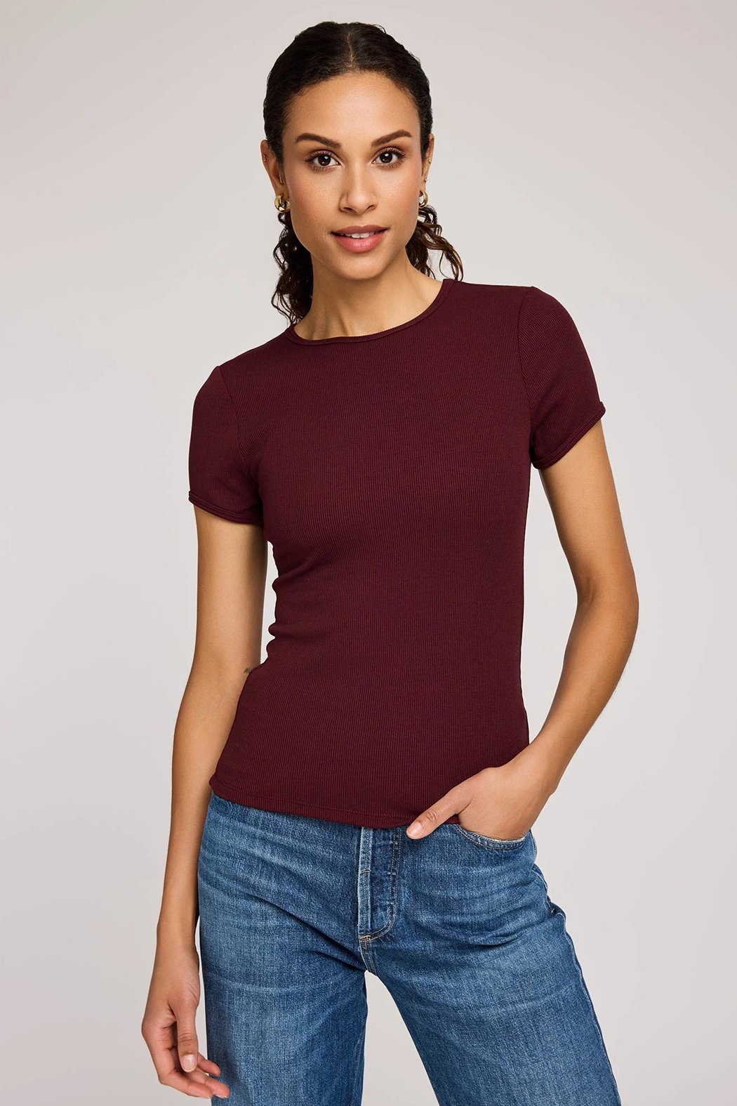 The Shania t-shirt is made of a soft and stretchy ribbed fabric that hugs the body. Features include a crew neckline and binding detail at the sleeve hem.