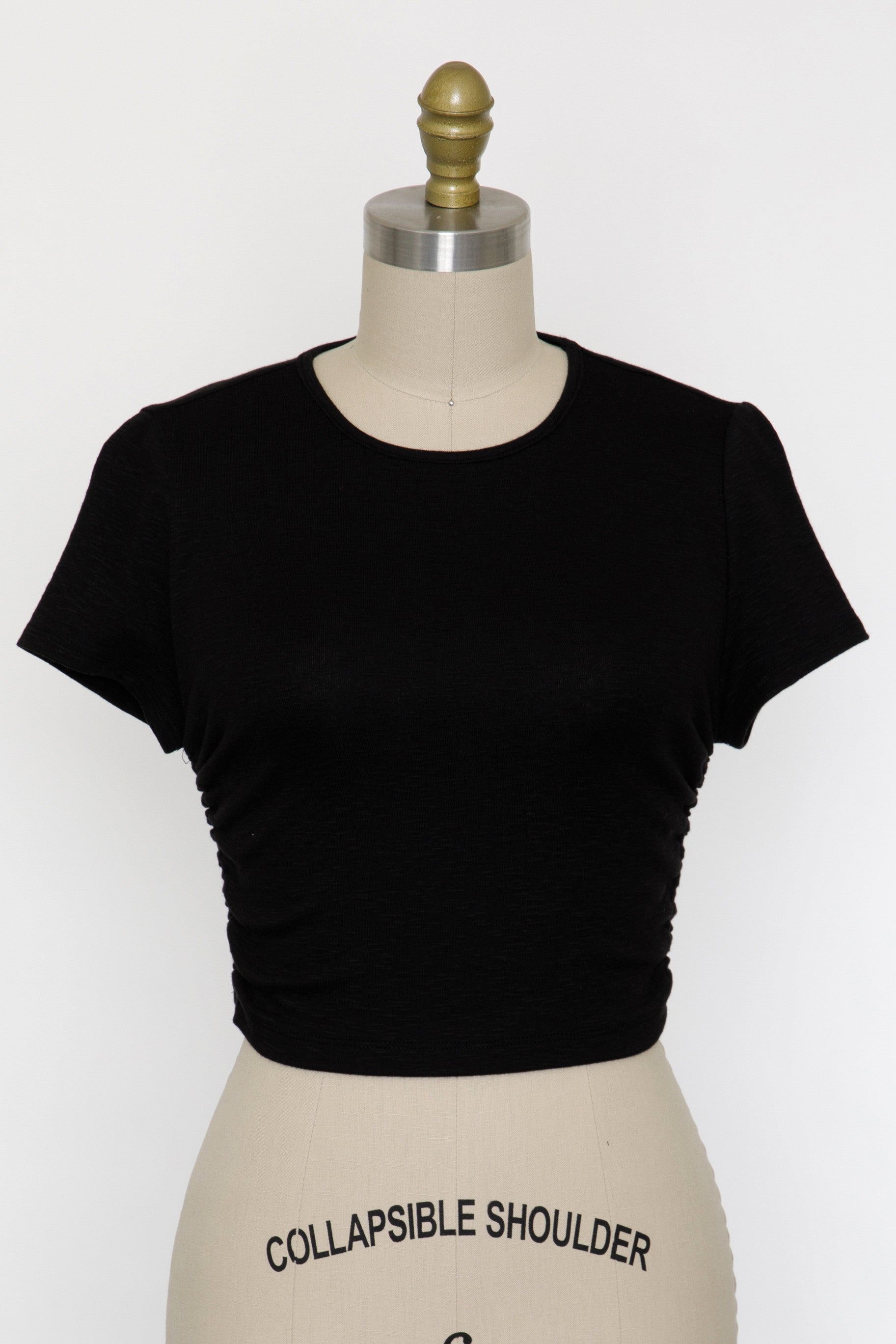 SIDE SHIRRING DETAILED CROP SHORT SLEEVE TOP. Fabric Contents 48% COTTOM 48% MODAL 4% SPAN Made in USA