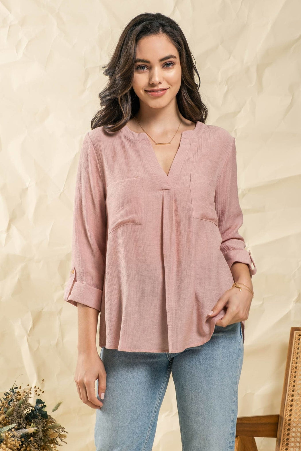 Split Neck Back Button 3/4 Tab Sleeve Top