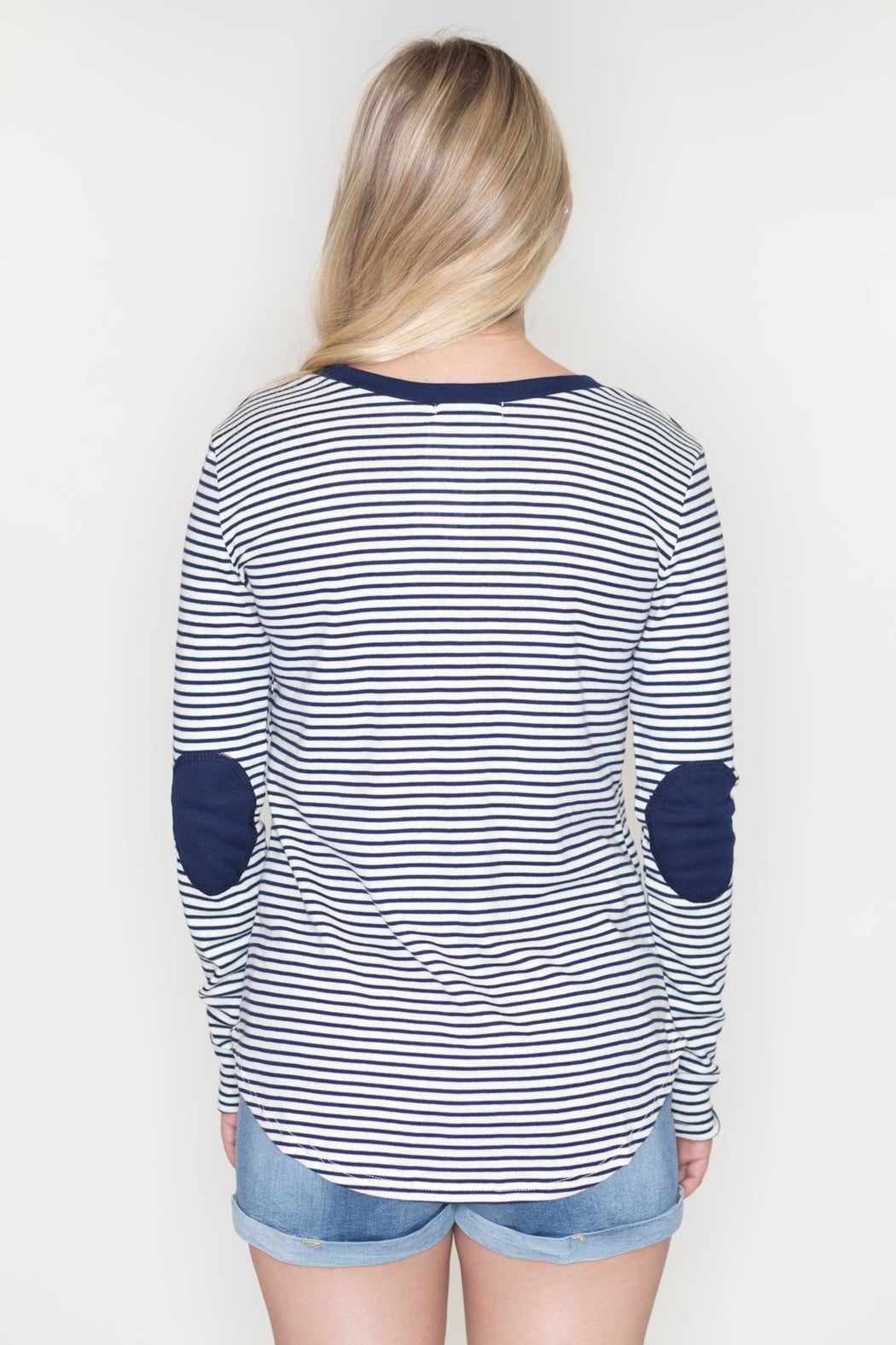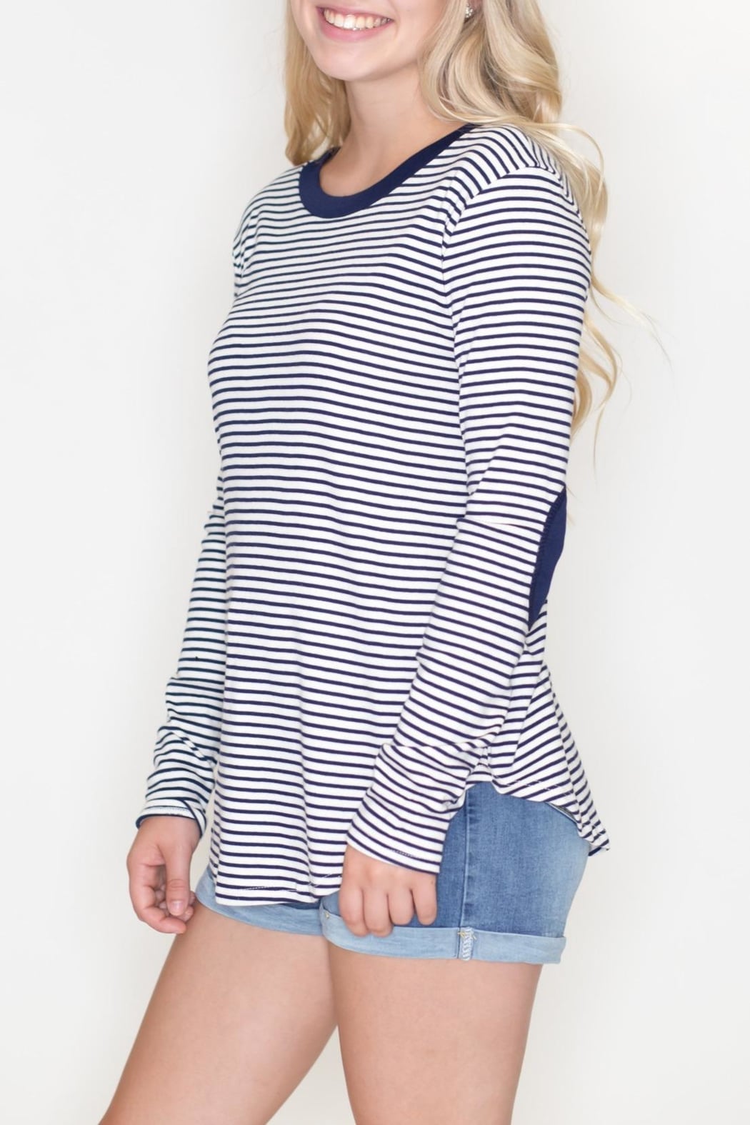 Nave and white striped long sleeve tunic top with round neck, elbow patches, relaxed fit and rounded hems.