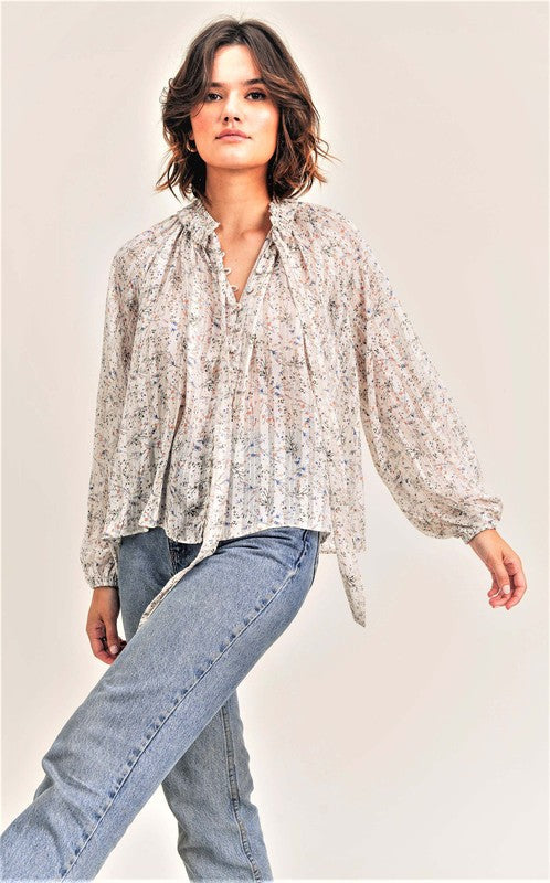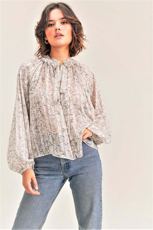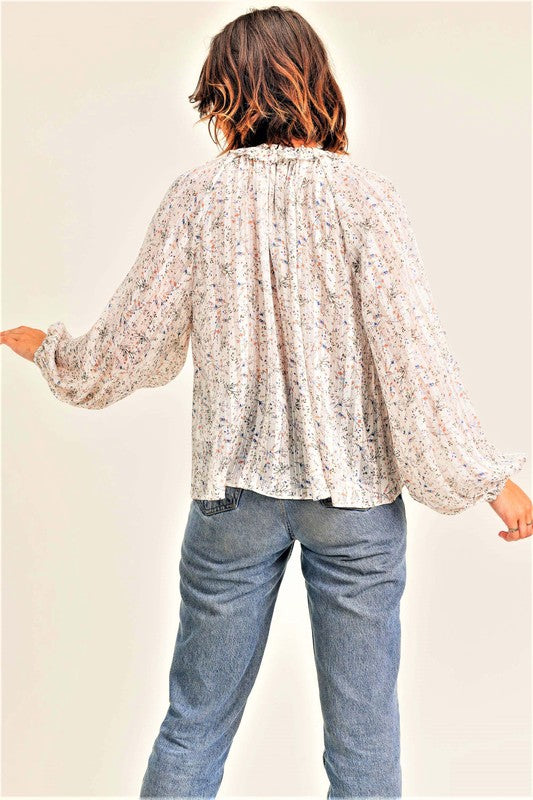 Wispy floral pattern with raw hem ruffled collar. Gold threads throughout. Tie at neck. Elastic cuffs. Fabric-covered button up front.