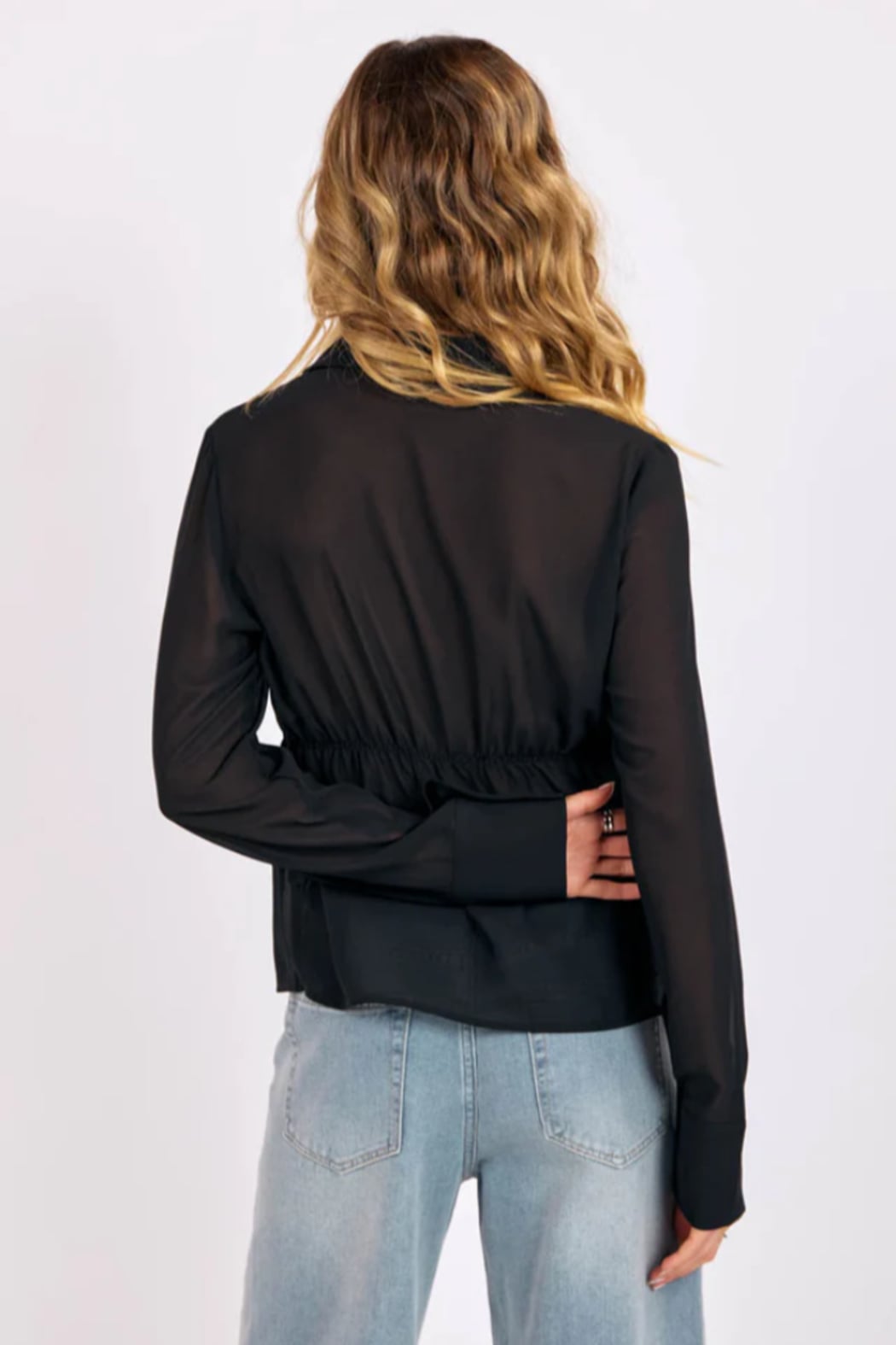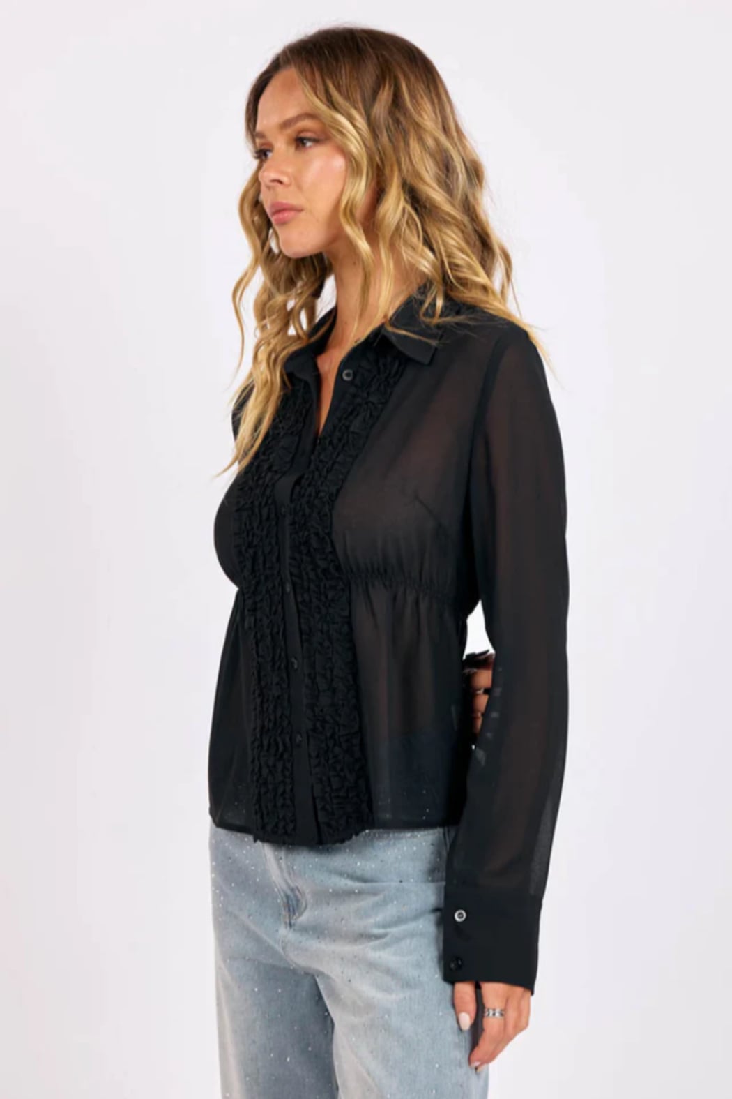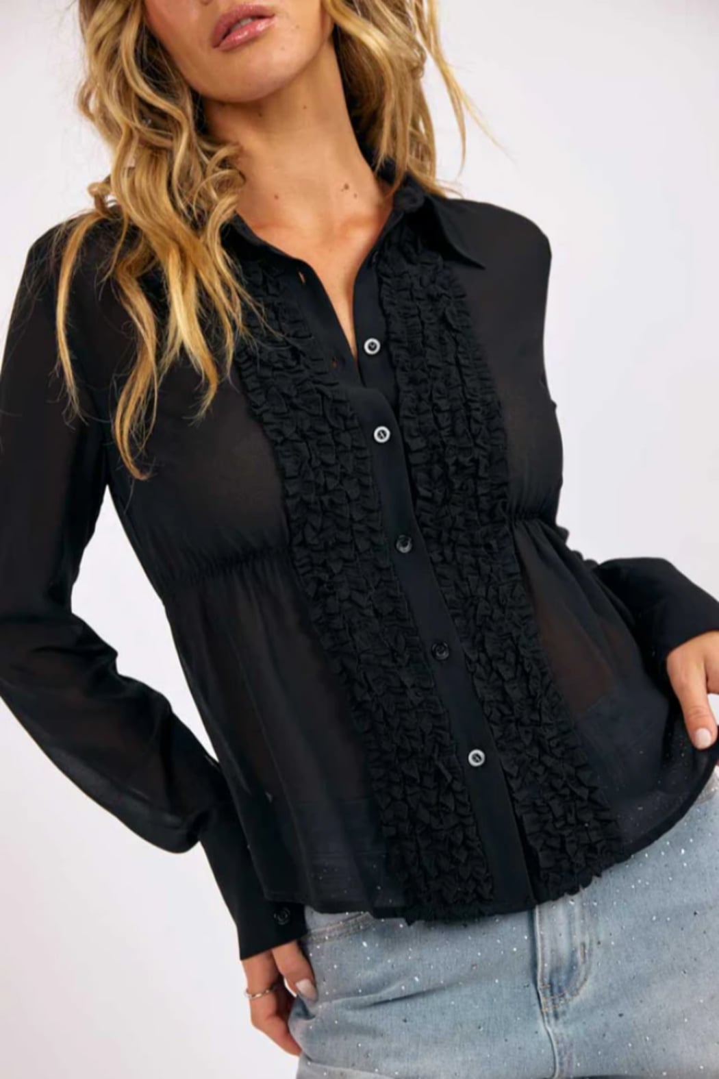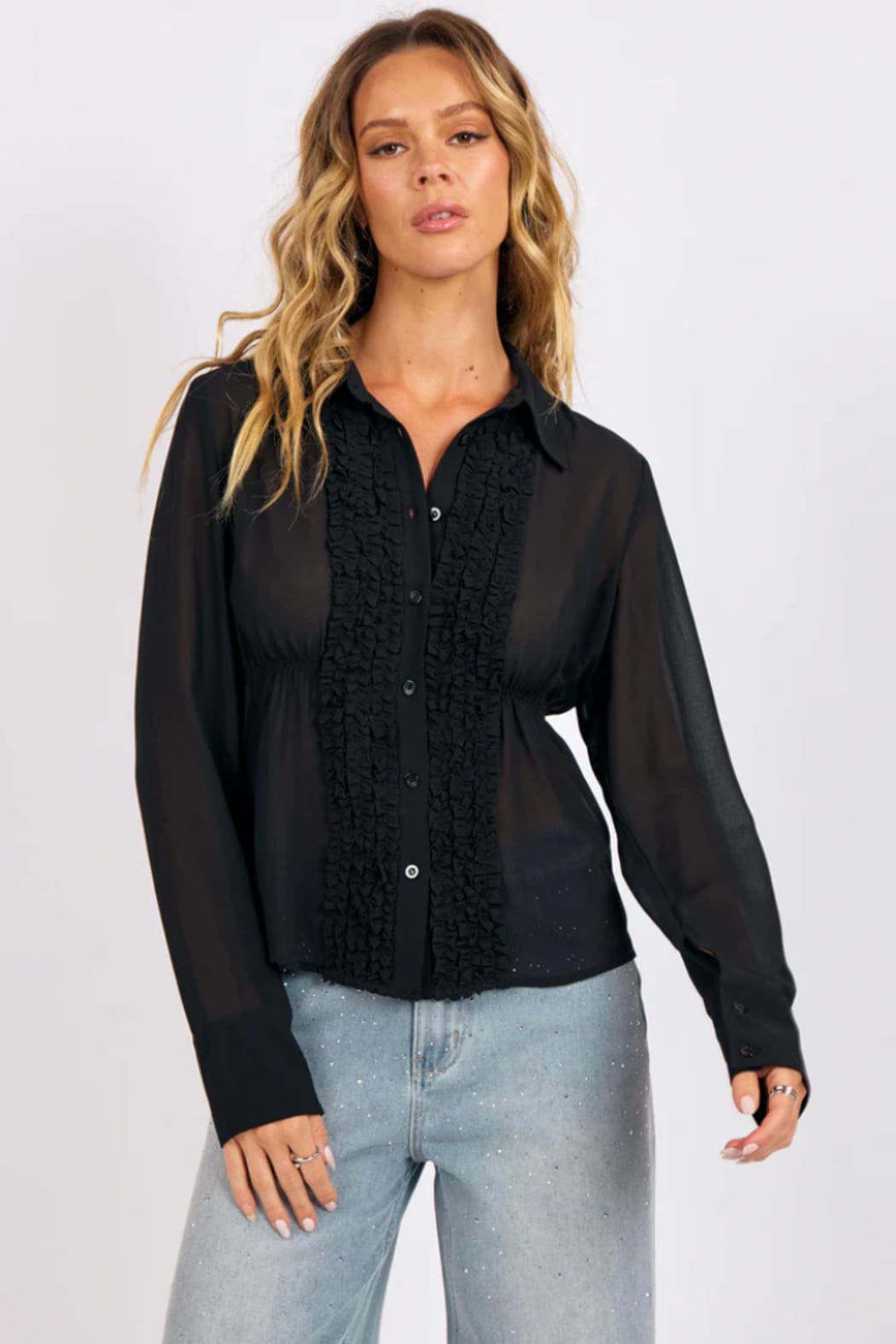 The Terra Sheer Ruffle Tuxedo Blouse from Sage The Label brings a modern, romantic edge to classic tailoring. Crafted in an airy sheer black fabric, it drapes beautifully while adding just the right amount of drama. Soft ruffled trim frames the button-front placket for a feminine twist, while the subtle cinched waist creates a flattering, gently defined silhouette. Effortlessly sophisticated, this blouse transitions from desk to dinner with ease, pair it with denim for an elevated everyday look or layer it over a sleek cami for an alluring night-out ensemble. A statement piece that feels timeless, refined, and unmistakably chic.