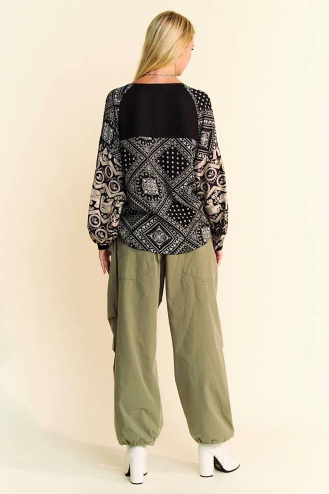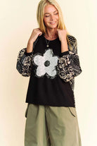 boho knit top, floral applique pullover, patchwork balloon sleeve, mixed print blouse, waffle knit sweater, casual chic fashion, boutique bohemian top, relaxed fit shirt, Nadya’s Closet