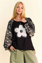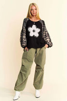 Bring bold personality and cozy texture together in this boho-inspired knit pullover. Featuring a soft waffle knit bodice and contrast balloon sleeves in intricate floral patchwork, this top exudes laid-back charm with artistic edge. The oversized floral applique adds a touch of whimsy, while the relaxed silhouette ensures easy movement and layering. Perfect for effortless day-to-night transitions, from boutique strolls to cozy evenings out.