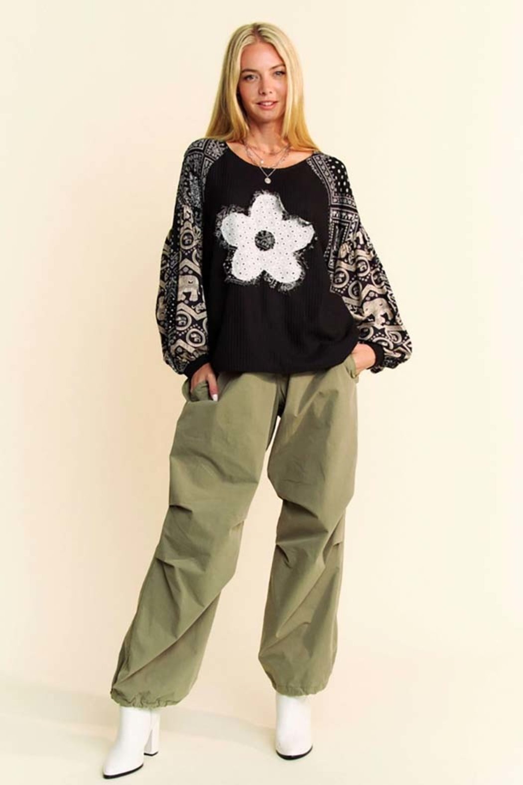 Boho waffle knit pullover with floral applique and patchwork balloon sleeves. A cozy, artistic boutique top blending texture, comfort, and creative flair — perfect for all seasons.