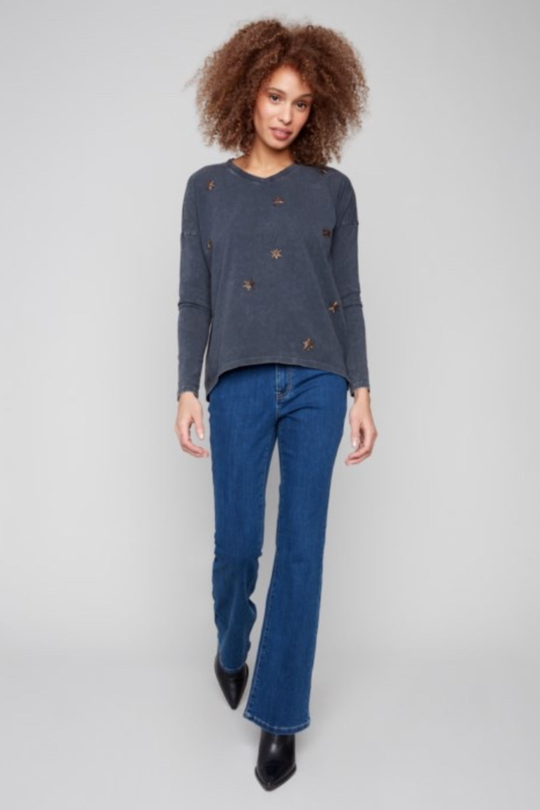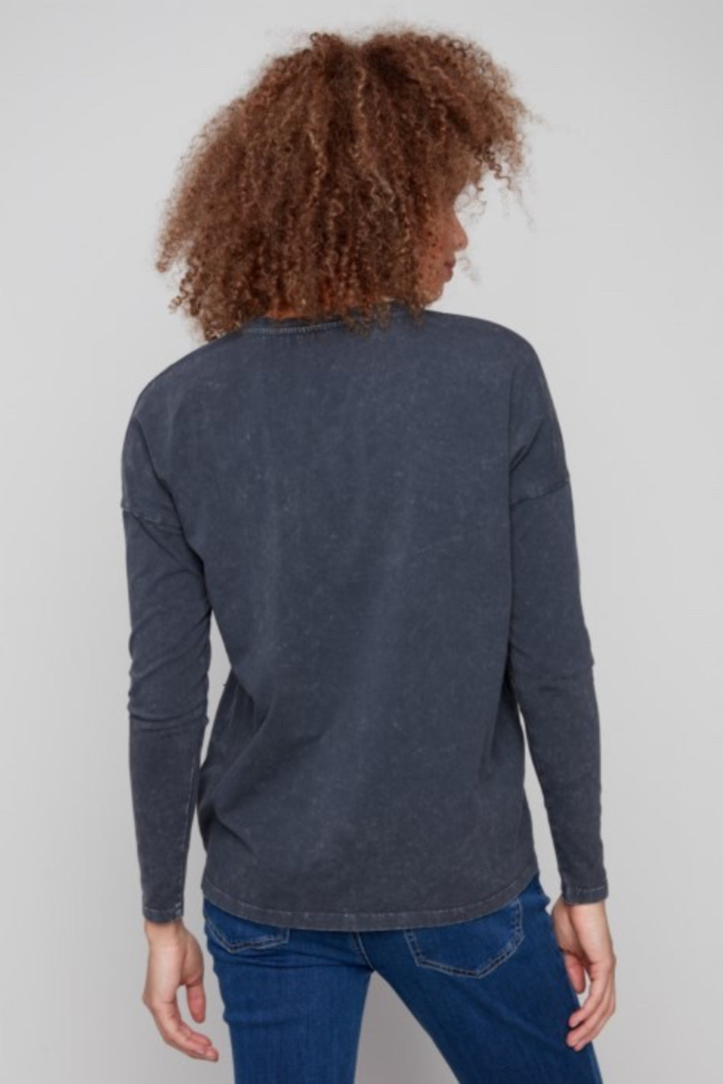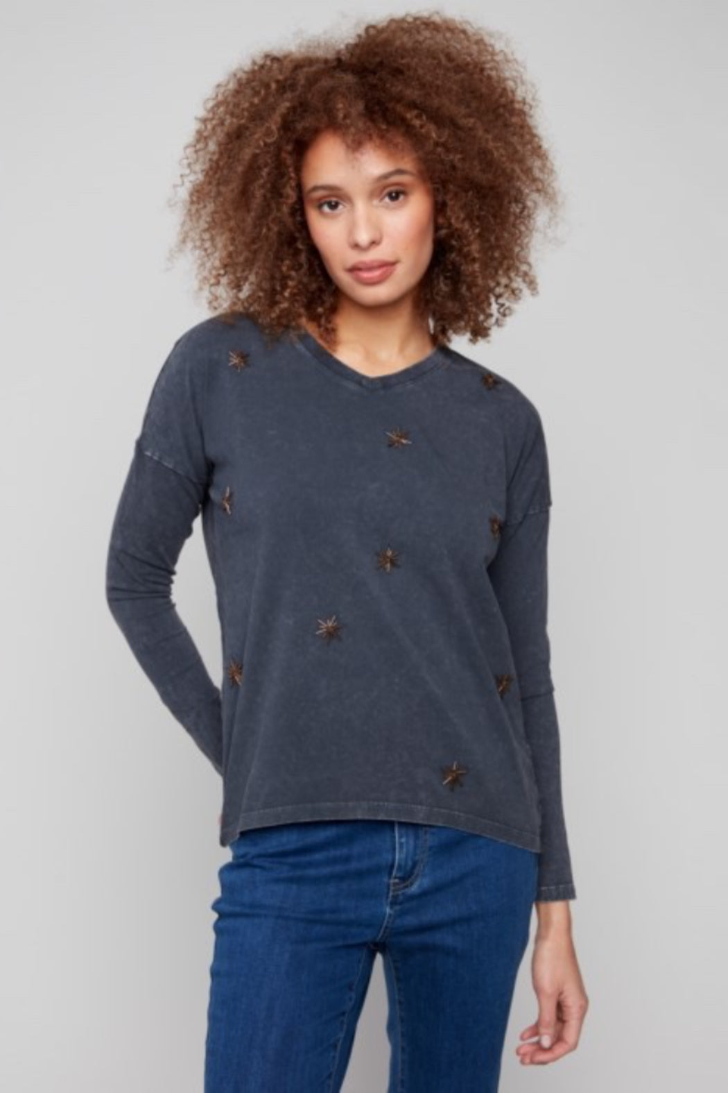 Long Sleeve Beaded Vintage Wash V-Neck Knit Top
