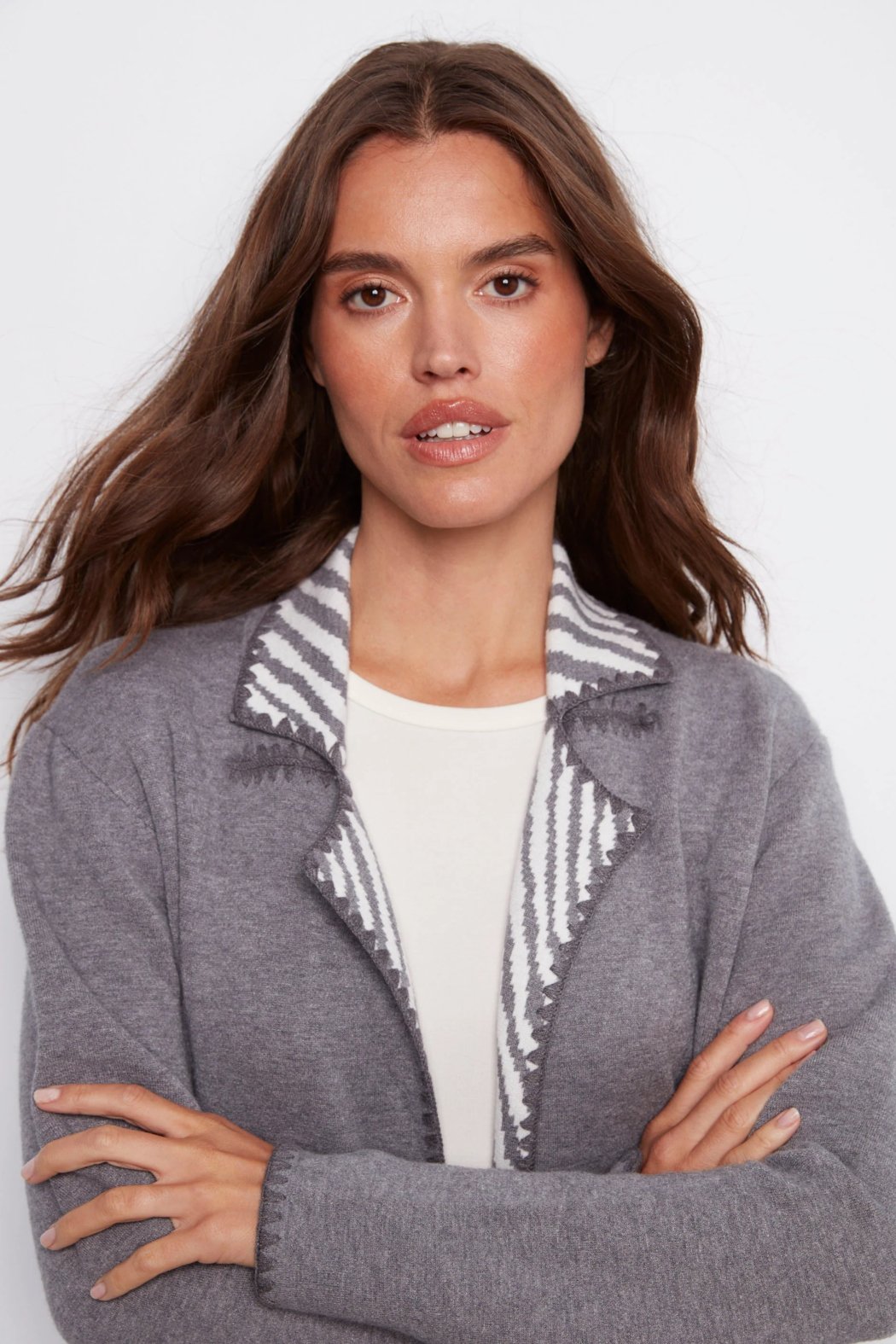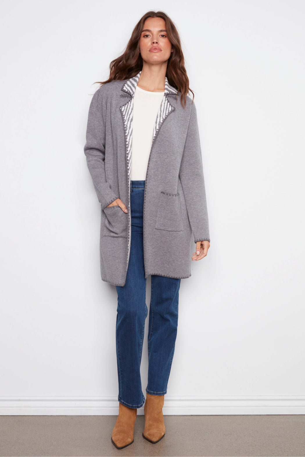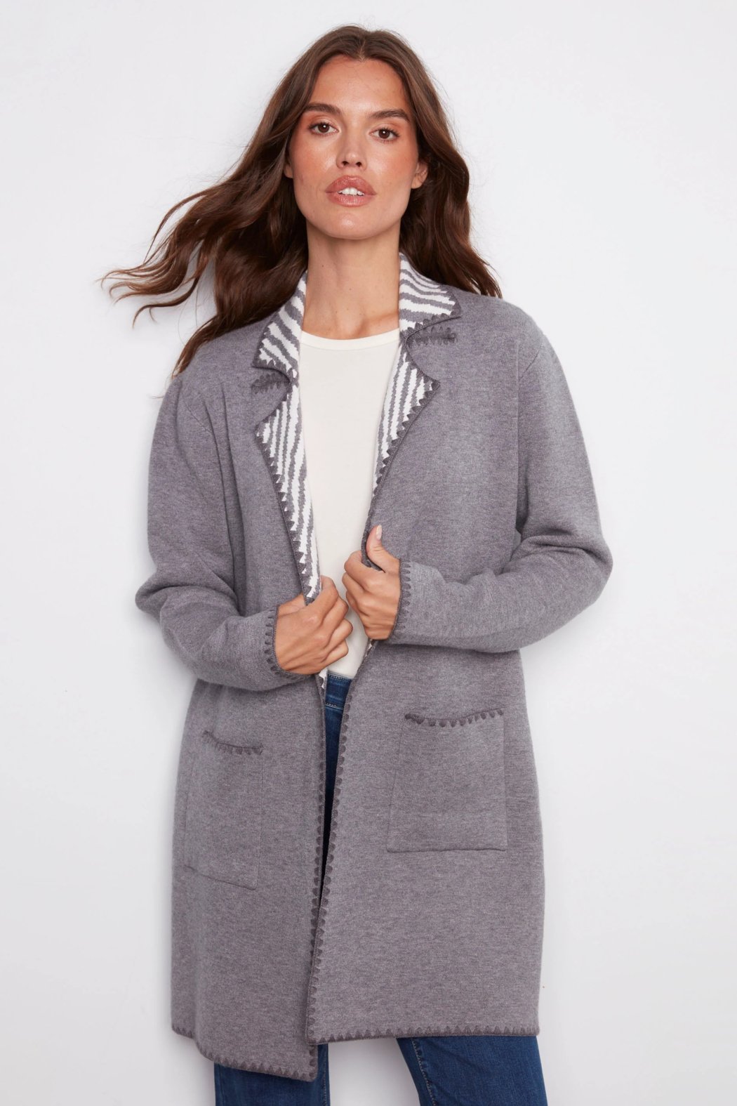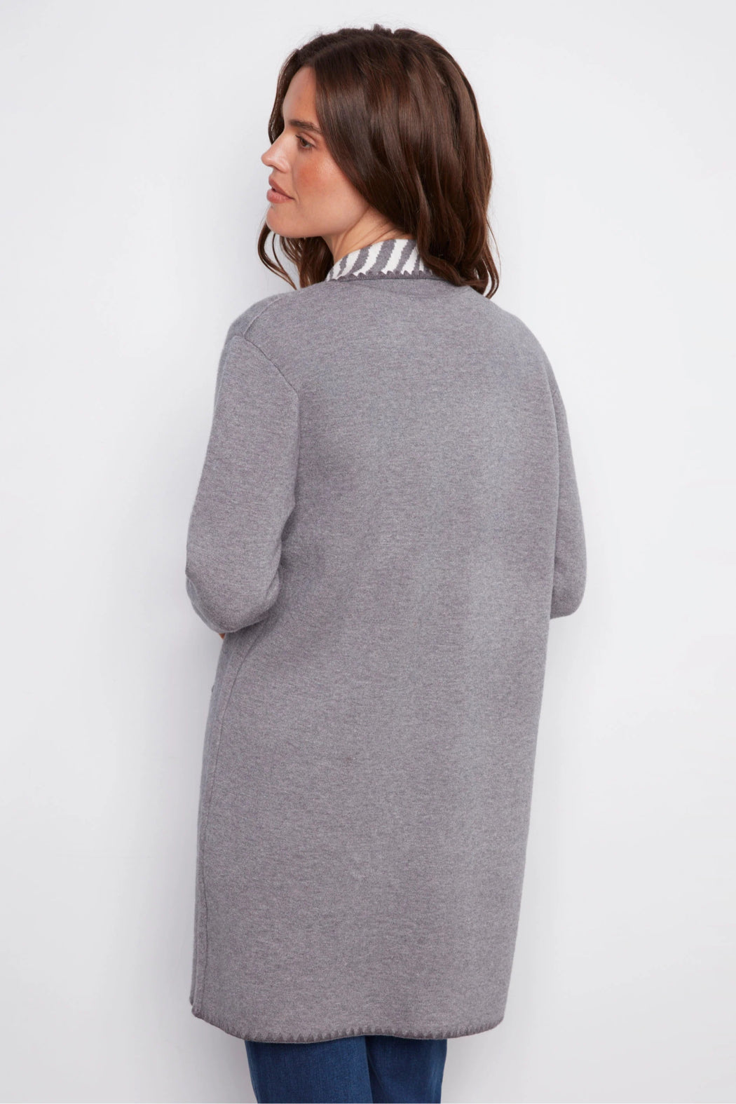 The Heather Grey Long Cardigan brings cozy sophistication to your fall wardrobe. Crafted from a soft, luxurious fabric blend, it features a chic zebra-striped lining and elegant blanket-stitch detailing. Front patch pockets add practicality without compromising style, making this cardigan the perfect companion for casual days or relaxed evening outings.