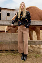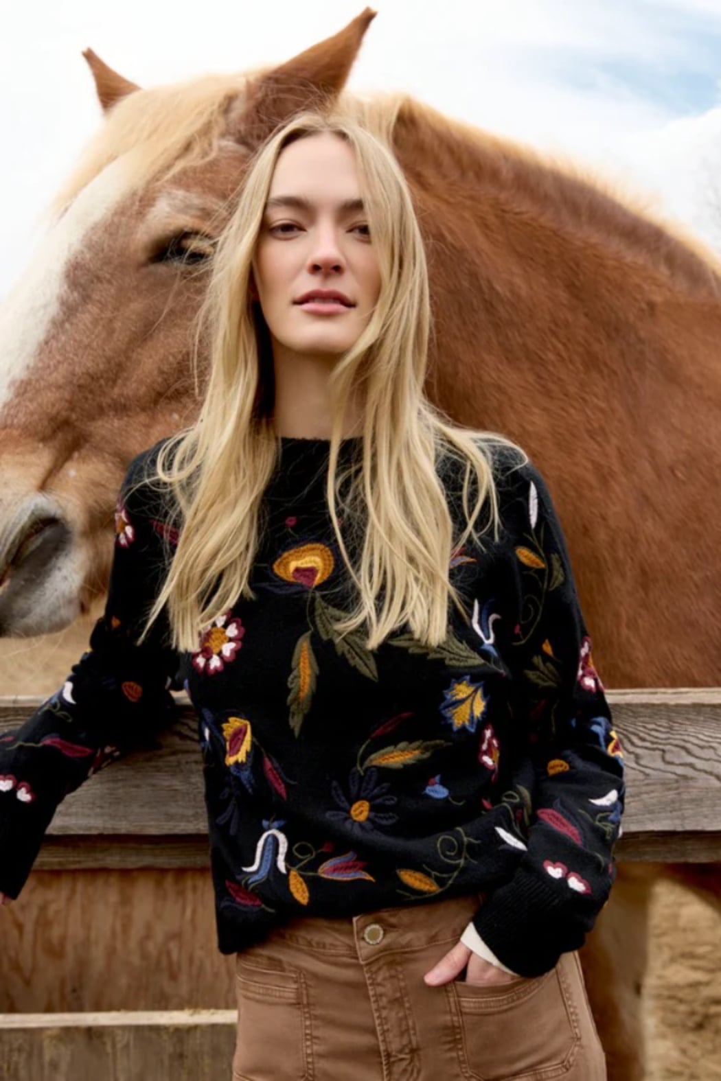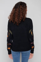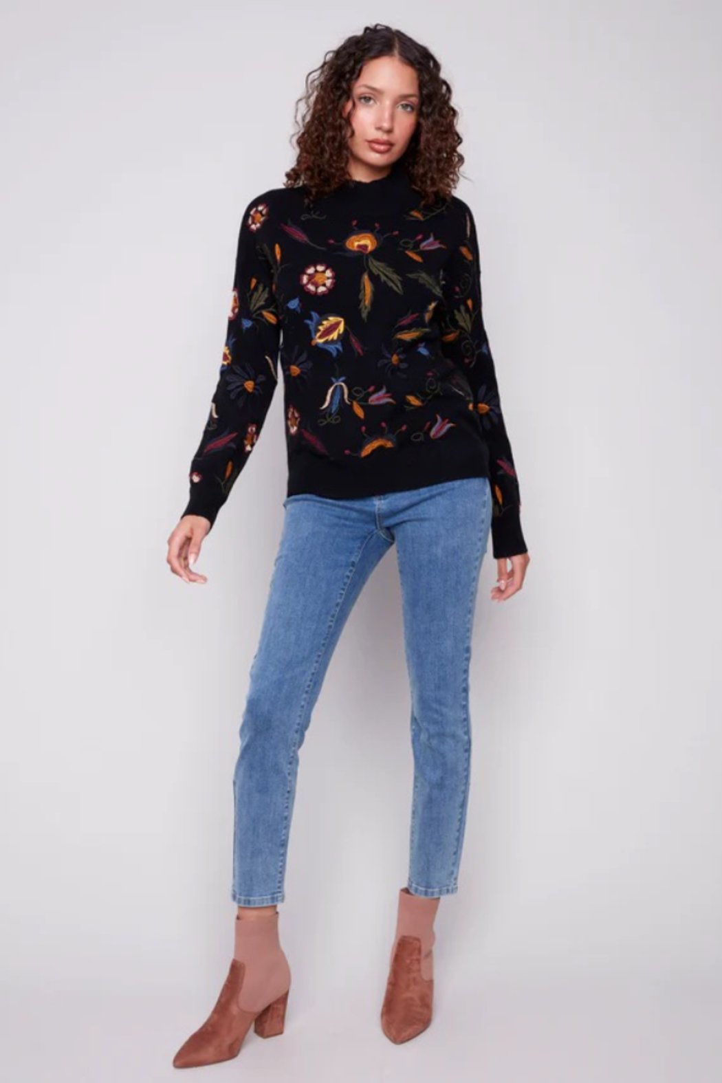 Fall in love with the charm of this black embroidered mock neck sweater. Combining comfort and style, the floral embroidery decorating the front and sleeves adds a whimsical, playful touch. Its cozy fit makes it a versatile must-have for your fall wardrobe, perfect for cooler days. Mock neck Embroidered floral details Long sleeves Ribbed neck, hem & cuffs