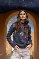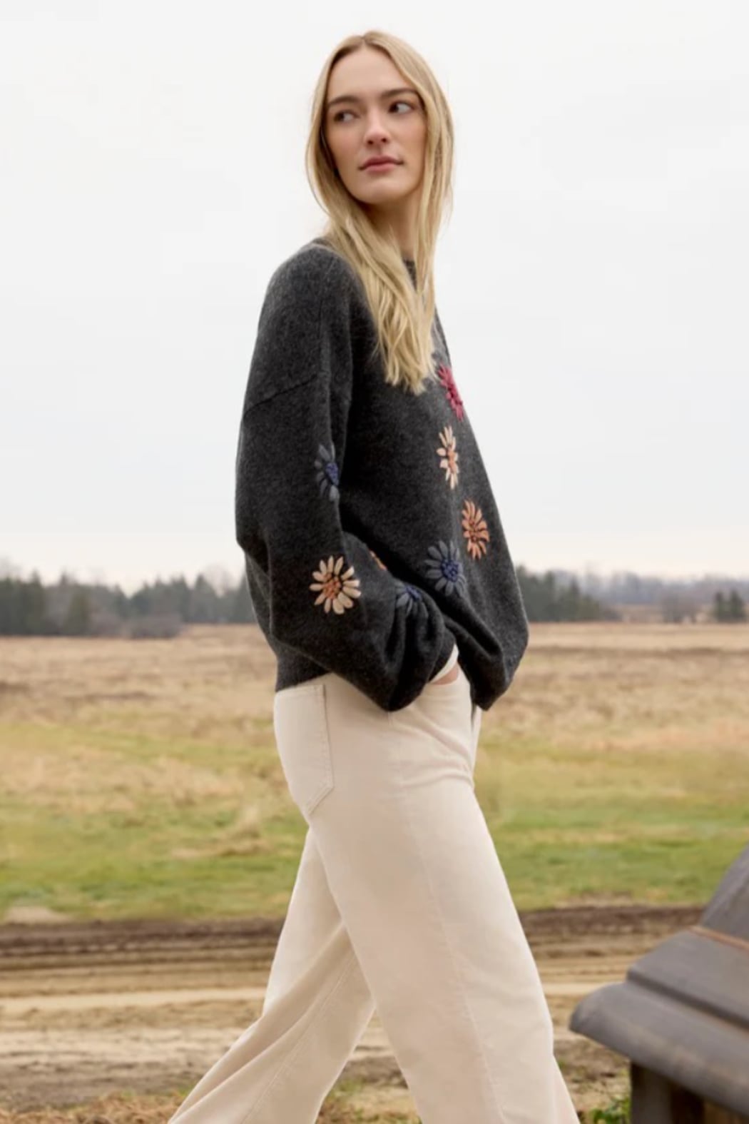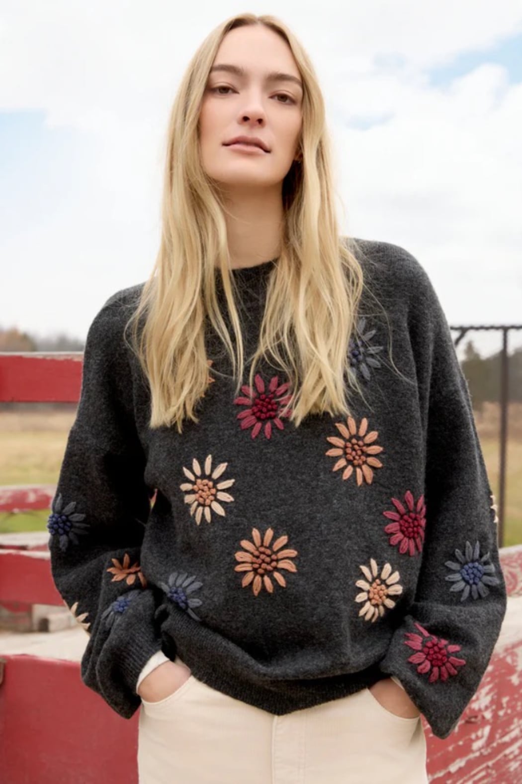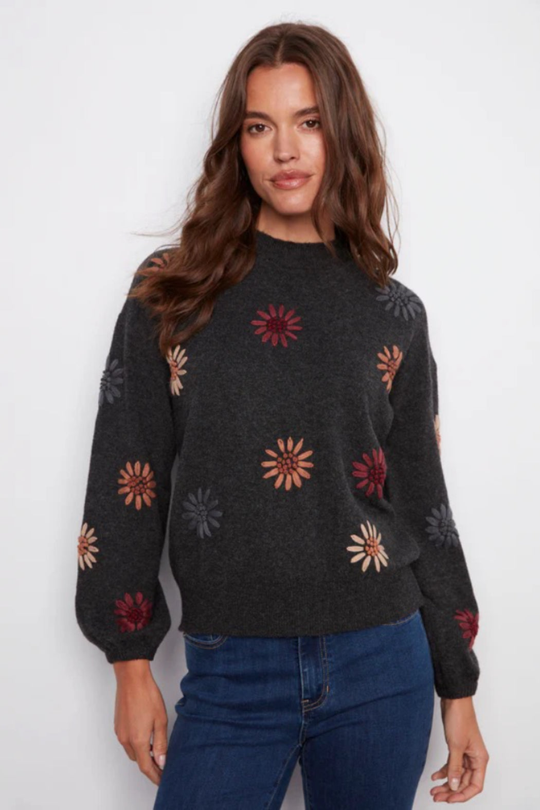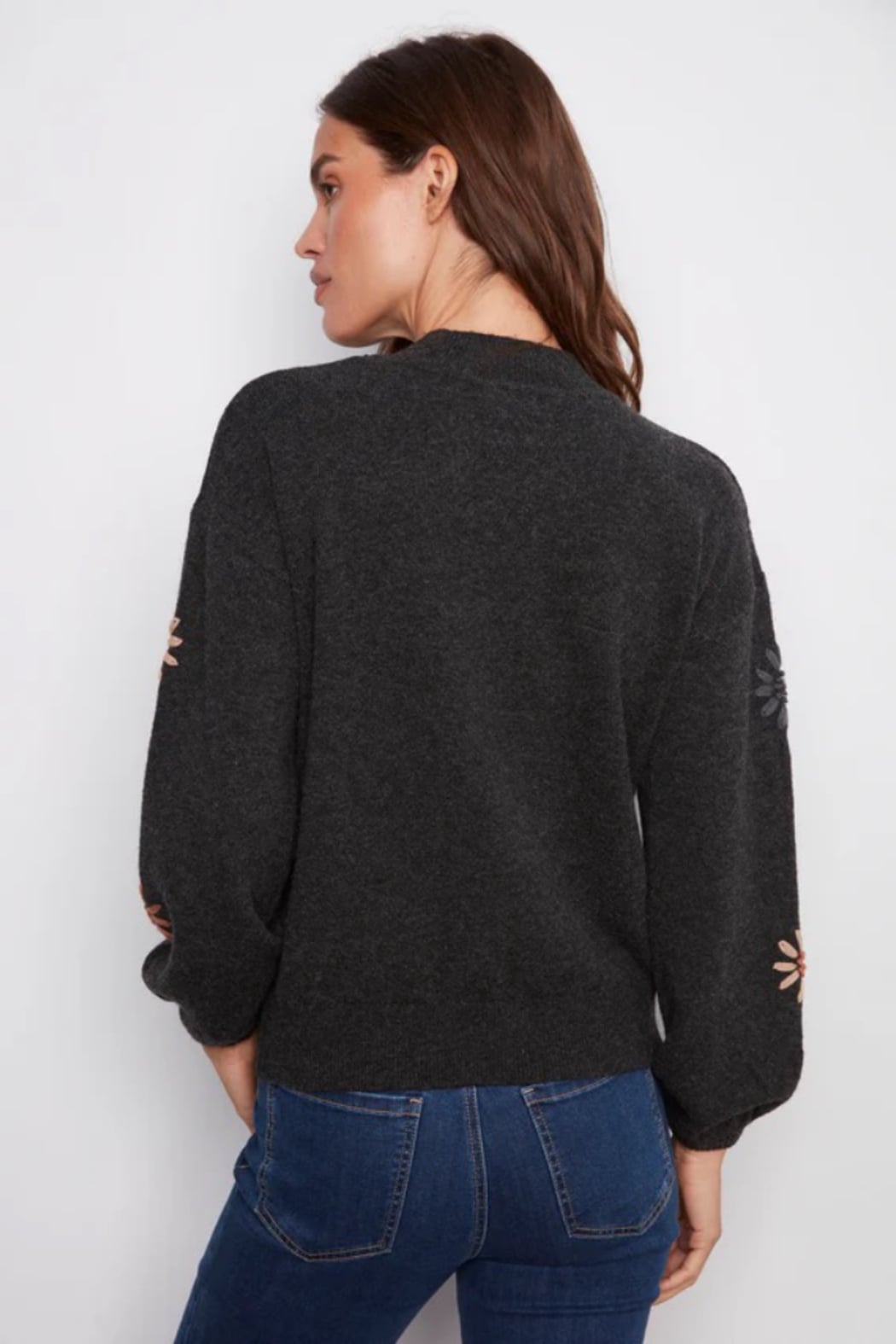 This heather charcoal gray sweater is a perfect addition to any fall wardrobe. The beautiful floral embroidery and mock neck provide a timeless yet contemporary look. Long sleeves with elastic cuffs add a subtle touch of sophistication. Perfect for layering or wearing on its own, it’s destined to become a favorite go-to piece. Mock neck Drop shoulder design Floral embroidery Elastic cuffs