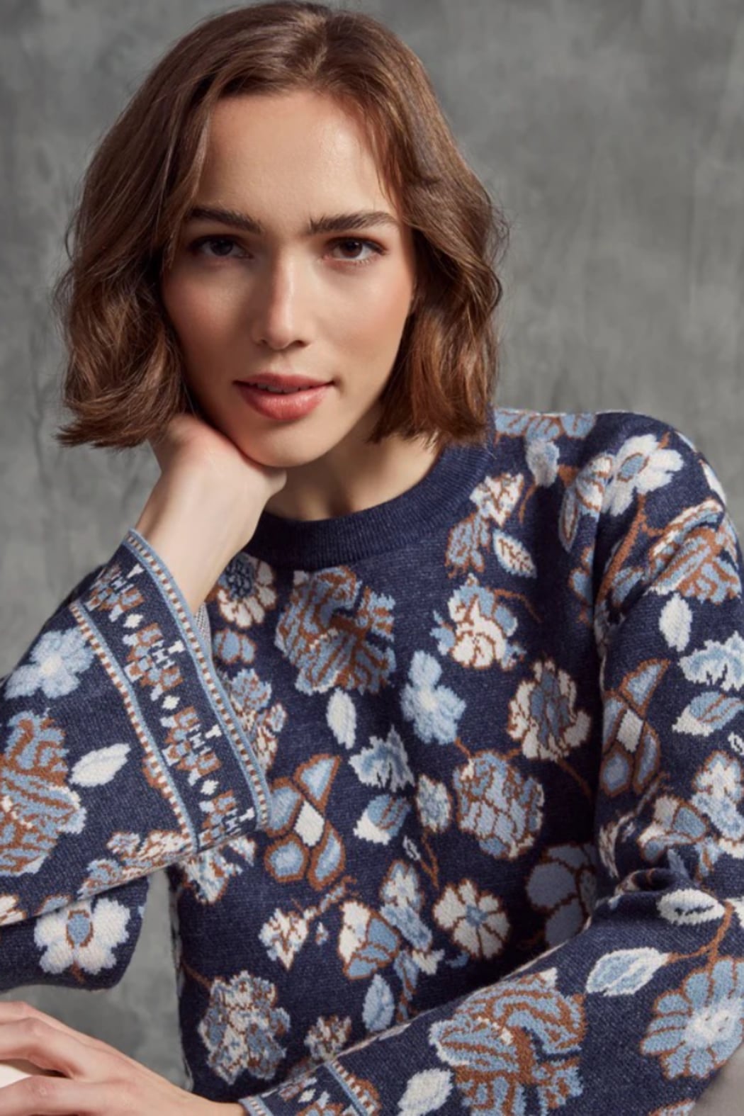 Unleash your chic side with our exquisite floral jacquard sweater, a masterpiece of rich textures and intricate designs. Perfect for pairing with your favorite jeans or an elegant skirt, this standout piece ensures you radiate style and comfort at any event. Elevate your fall wardrobe with this sophisticated addition and make every step a fashion statement.