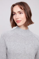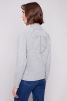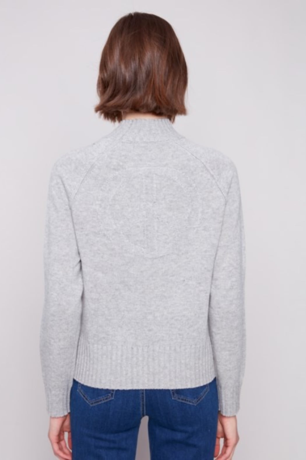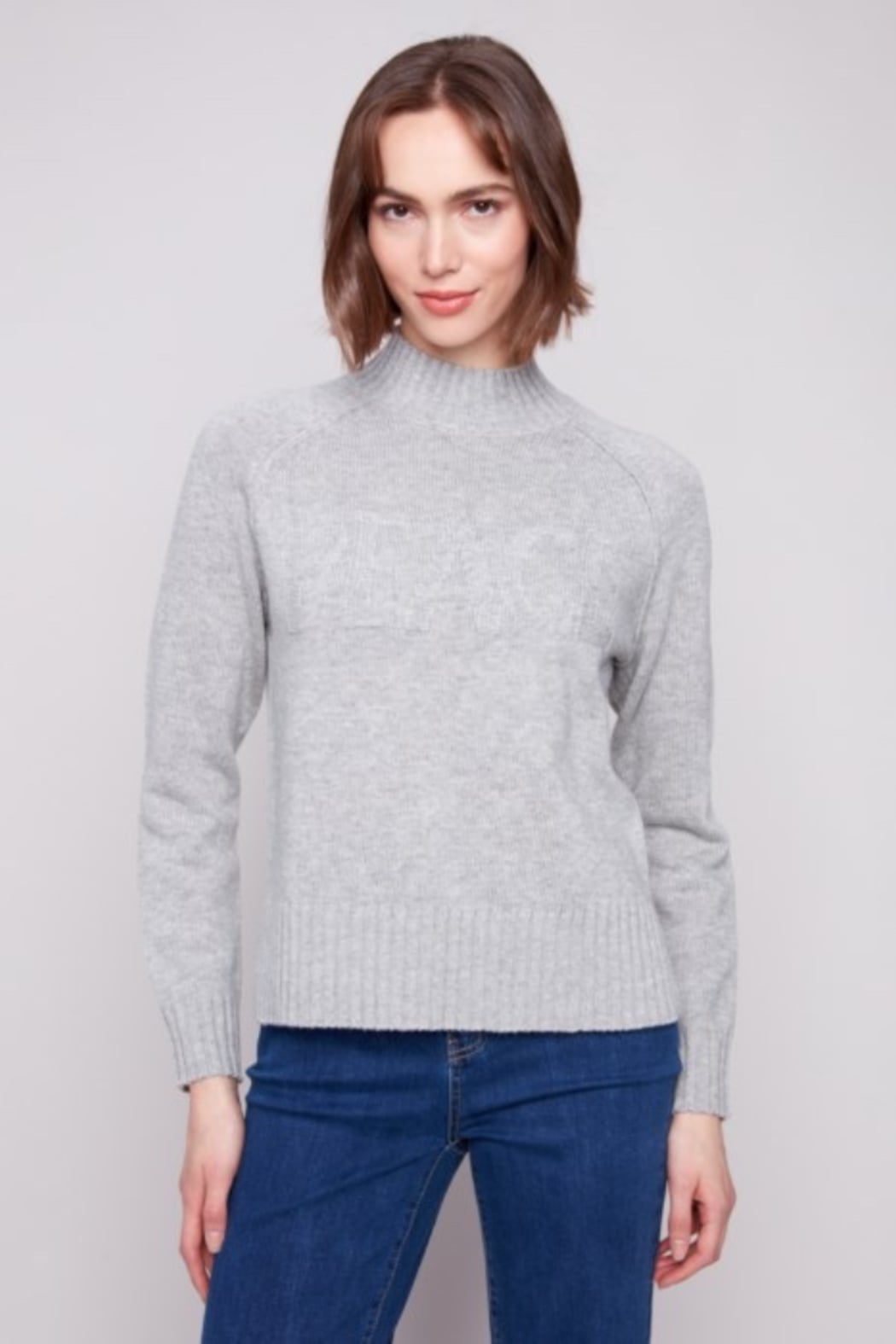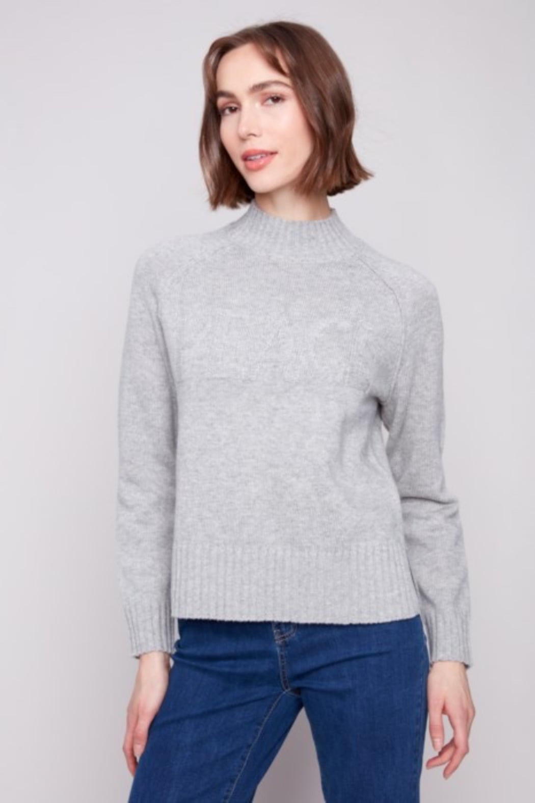 Placed Jacquard Mock Neck Sweater with the word PEACE on the front and PEACE sign on back.