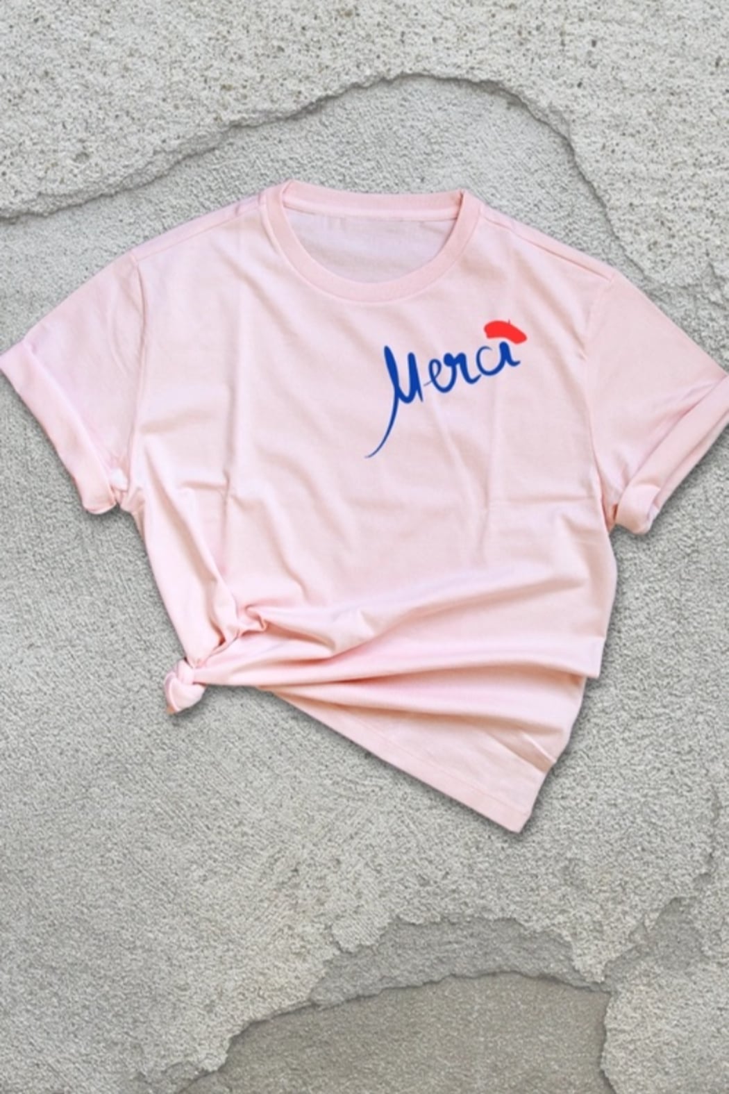 Add a little Parisian flair to your wardrobe with the short sleeve Merci Tee! This playful French graphic t-shirt features the word “Merci” + a bold “I,” topped with a classic red beret for the perfect mix of chic + cheeky. Whether you're dreaming of strolling through Paris or sipping espresso at a sidewalk cafe, this tee brings French girl vibes to any outfit.