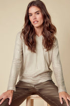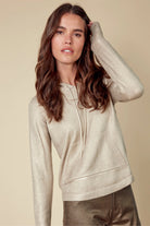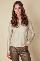 Effortlessly shine this fall with this Metallic Knit Hoodie Sweater in a beautiful champagne beige color. Its soft texture and gentle shimmer make it a standout top in any wardrobe. Ideal for bringing elegance to your everyday look, its long sleeves and adjustable hood offer both comfort and style.