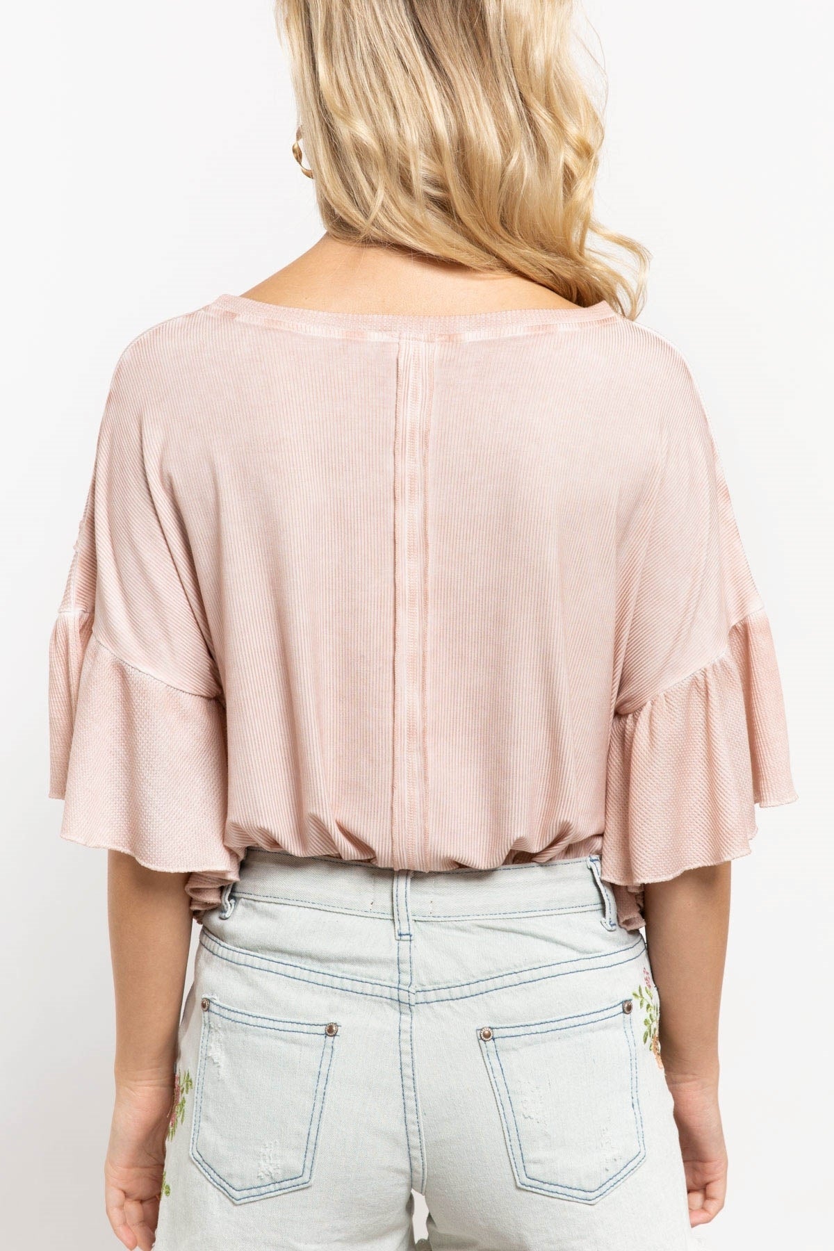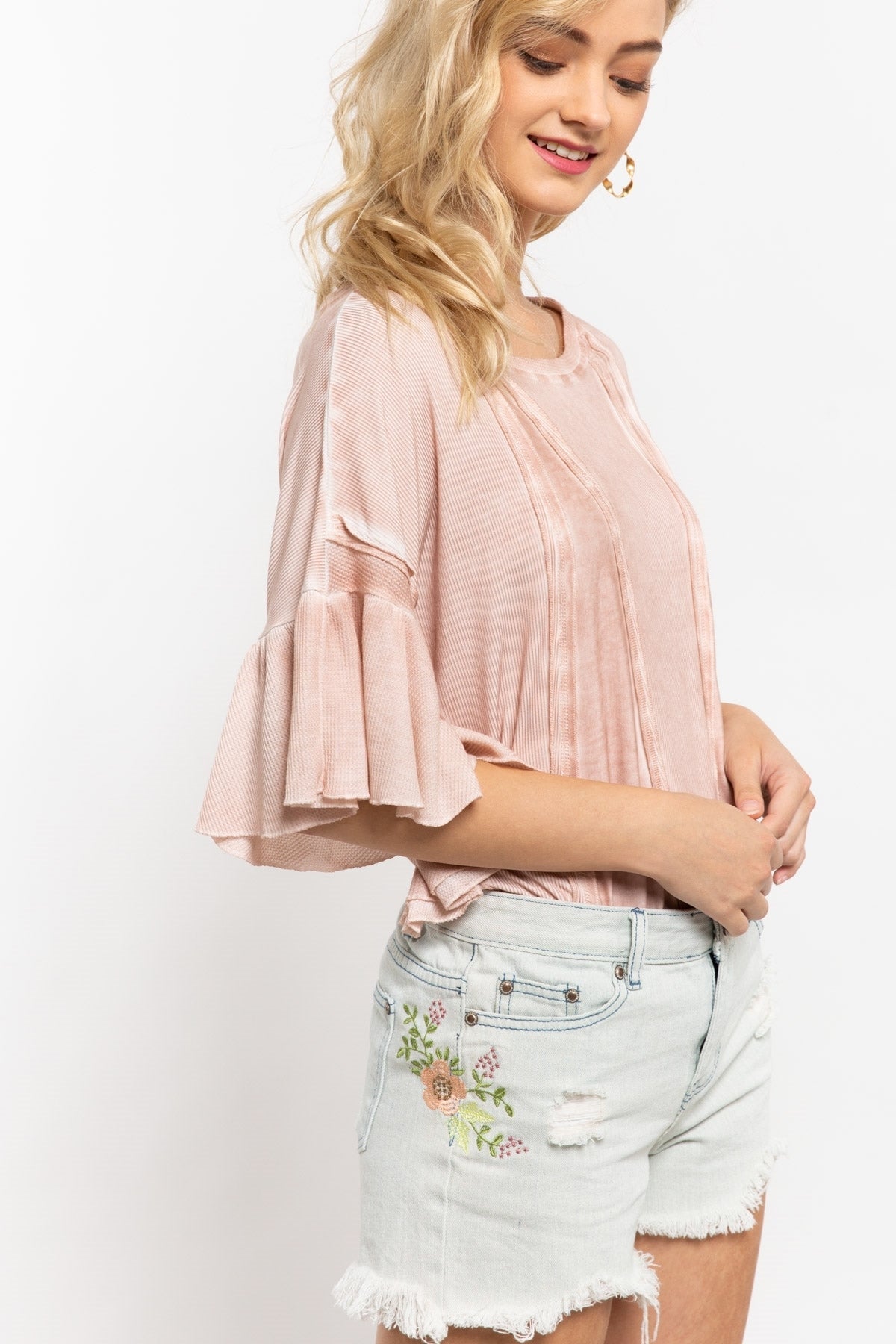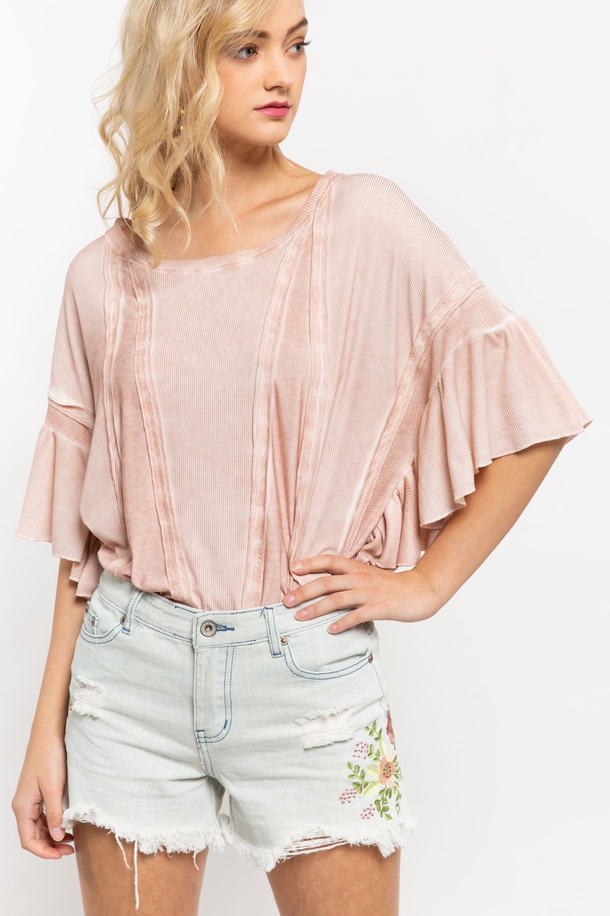 Boxy fit knit top with thermal and ribbed fabrication as contrast; boat neck; raw edge seam detail on body and sleeve with ruffle sleeve.