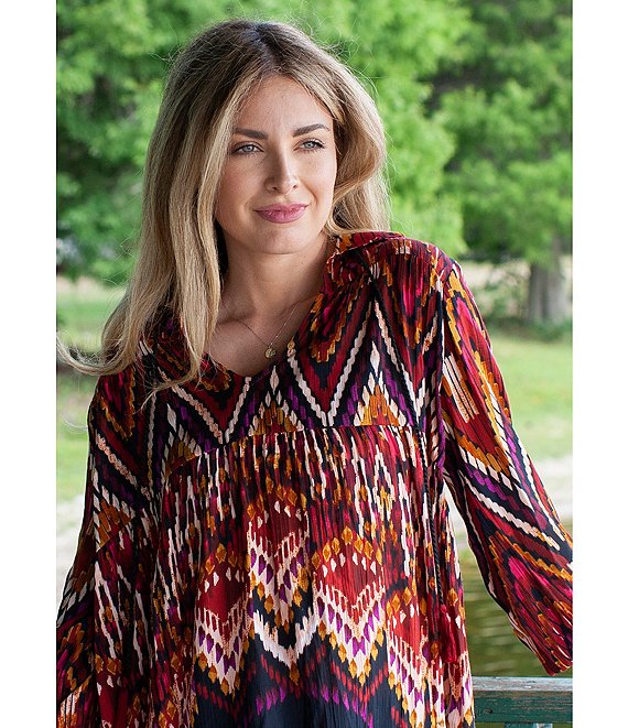11834 Lara Woven Print Tie Point Collar V-Neck Long Sleeve Tassel Hem Top by Caite & Kyla
