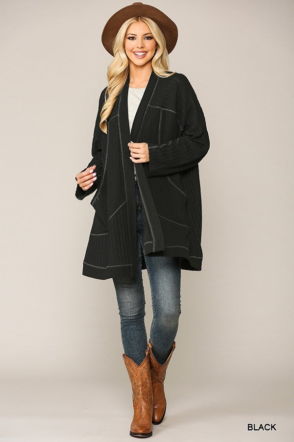Soft Rib Knit Cardigan with Contrasting Stitch Detail