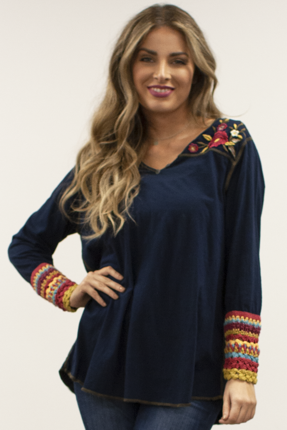 Our Adele Tunic features a navy blue body with colorful vintage-inspired embroidery on the shoulders and back, detailed buttons along the neckline, yellow stitching around the seams, and colorful crocheted sleeve from the cuff to the mid part of the arm!