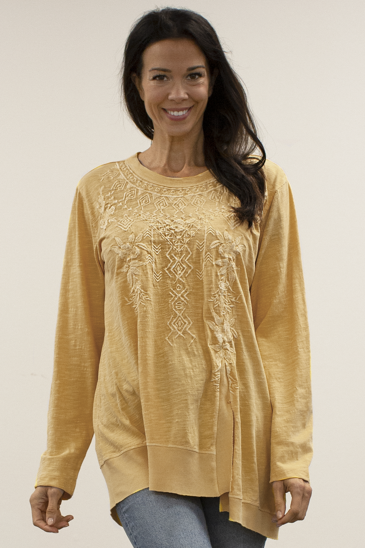 This comfy, lightweight top will be your NEW fall fave! Featuring a split tunic in front, vintage-inspired embroidery across the bodice, a wide and narrow asymmetric rib knit hem for style, and comfortable round neck, this tunic will look GREAT with all your fall shackets!