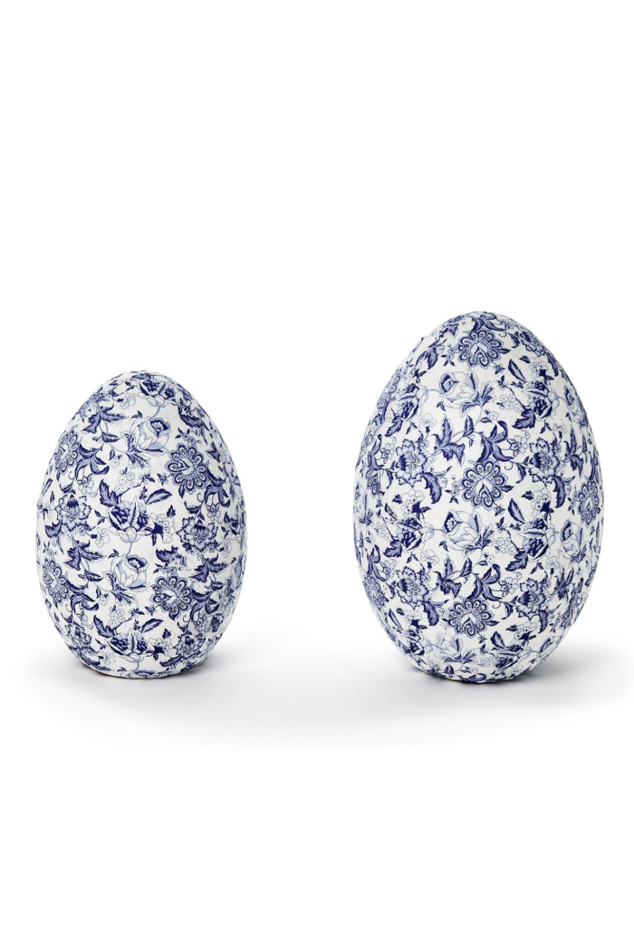 Add a touch of timeless elegance to your decor with this set of two beautifully crafted eggs, each showcasing intricate patterns in classic blue and white. Each oversized egg features a lightweight inner and is carefully covered in traditional paper mache for a unique and beautiful effect.