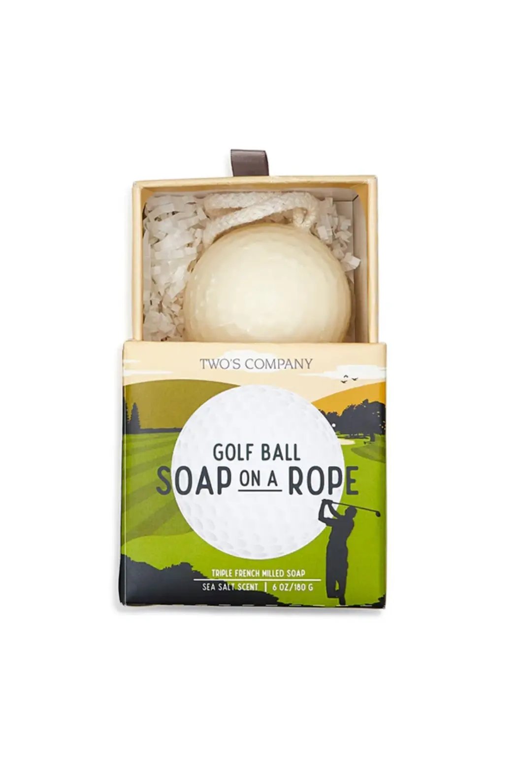 This soap on a rope is formulated with triple French milled soap and molded in a golf ball shape. The attached rope makes it convenient and easy to use in shower or bath. Fragranced in a mild Sea Salt scent, this 4.9 oz bar of soap is an ideal gift for any lover of golf. Wet hands and work the soap until rich lather forms; rinse thoroughly. Gift Box included. Fore & Enjoy!
