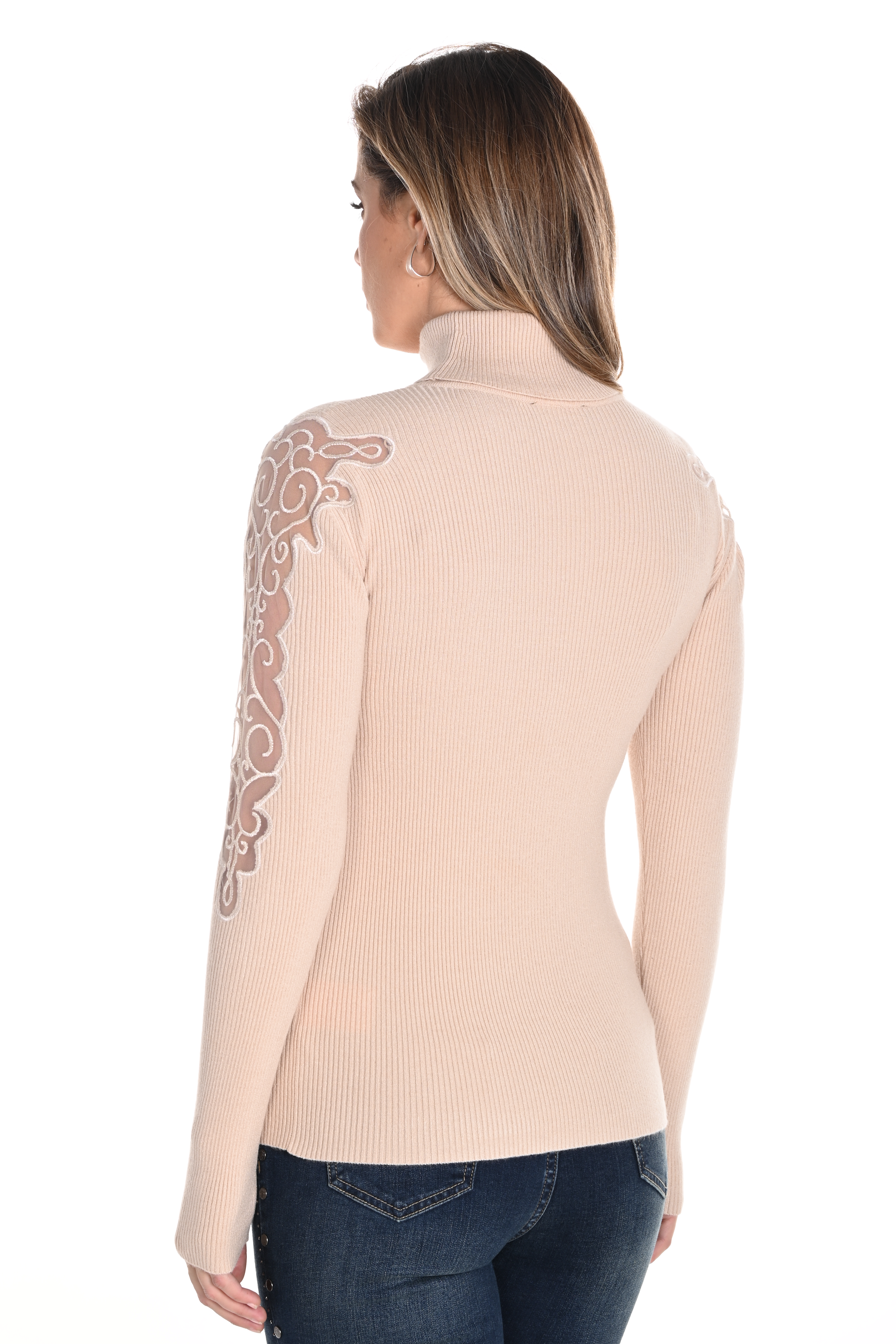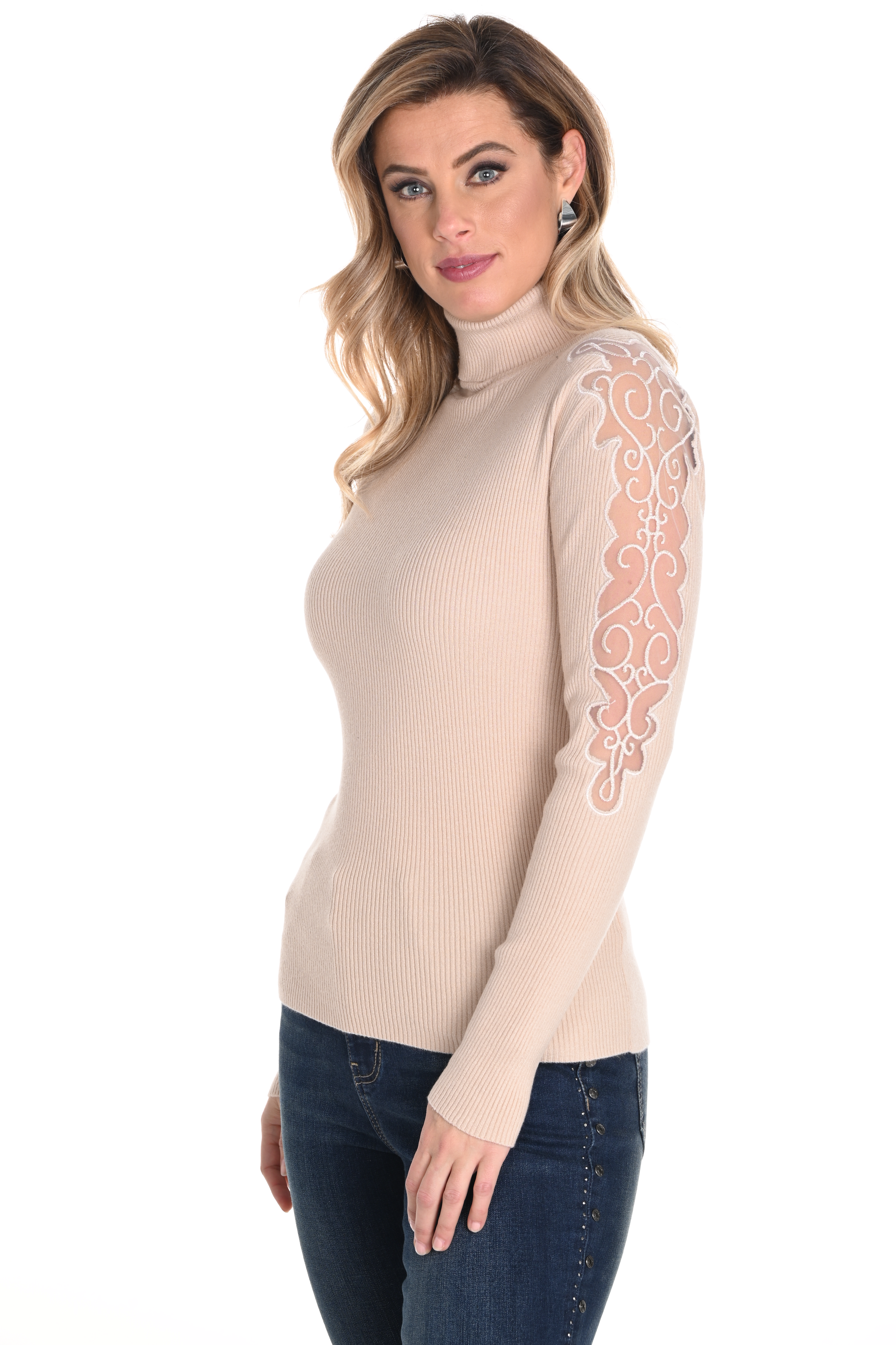 This Frank Lyman sweater is a versatile and elegant piece that effortlessly combines classic and contemporary elements. Its refined lace detailed sleeves and sleek silhouette make it a must-have for those seeking to elevate their wardrobe with a touch of timeless charm.