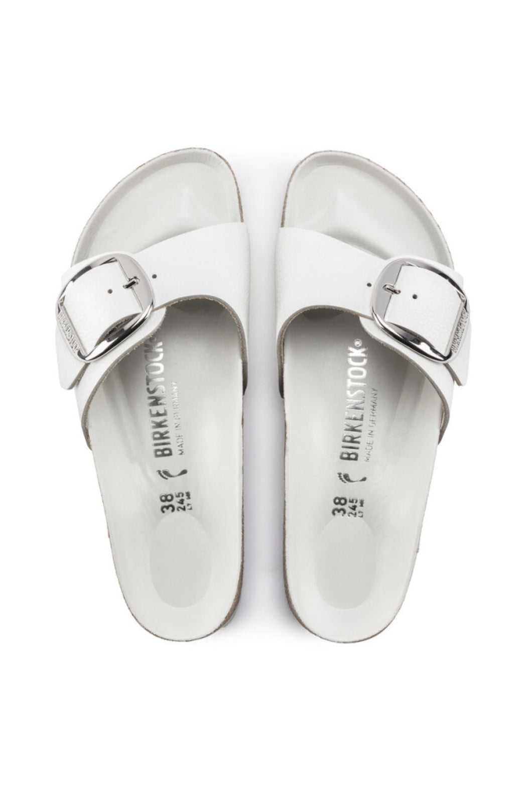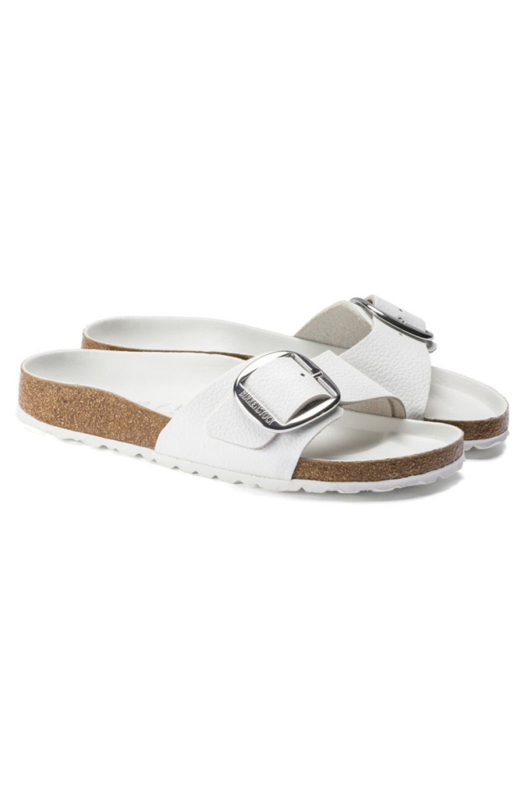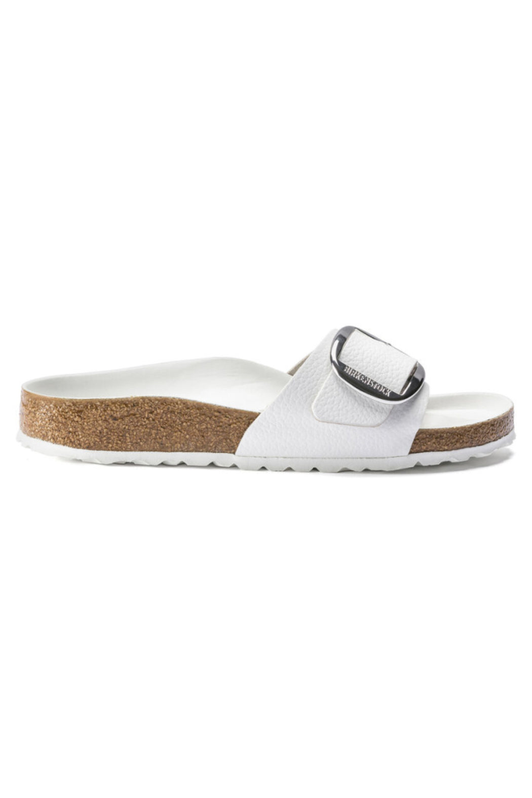 A strap, a buckle and a contoured cork footbed are masterfully combined to create the original Birkenstock sandal - the Madrid. An iconic slide with amplified buckle accent. The lining of the semi-exquisite footbed is covered with soft smooth leather and matches the upper in color. The upper is made from high-quality, especially soft natural leather.
