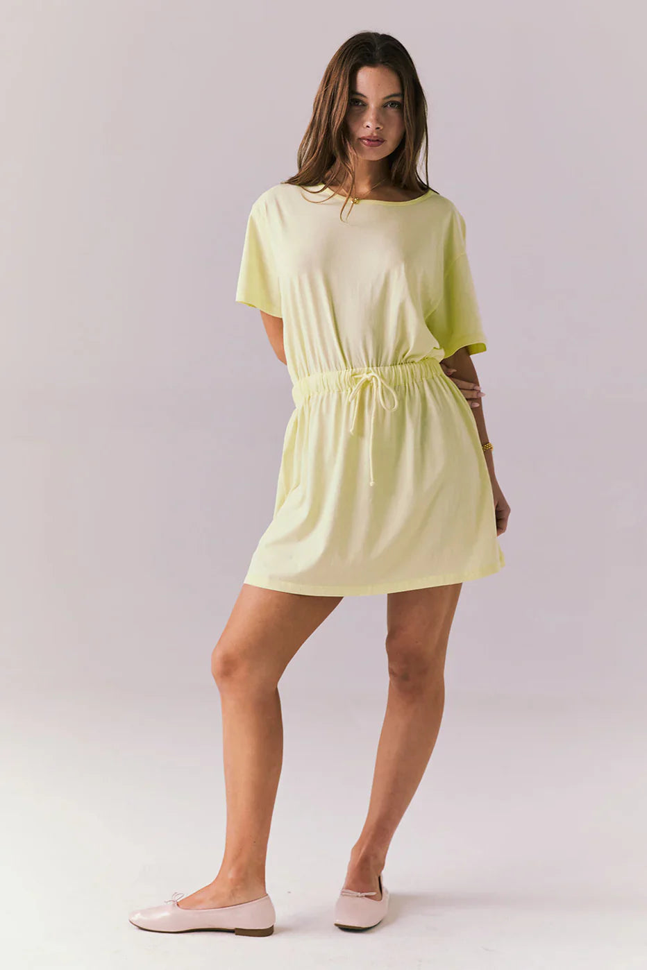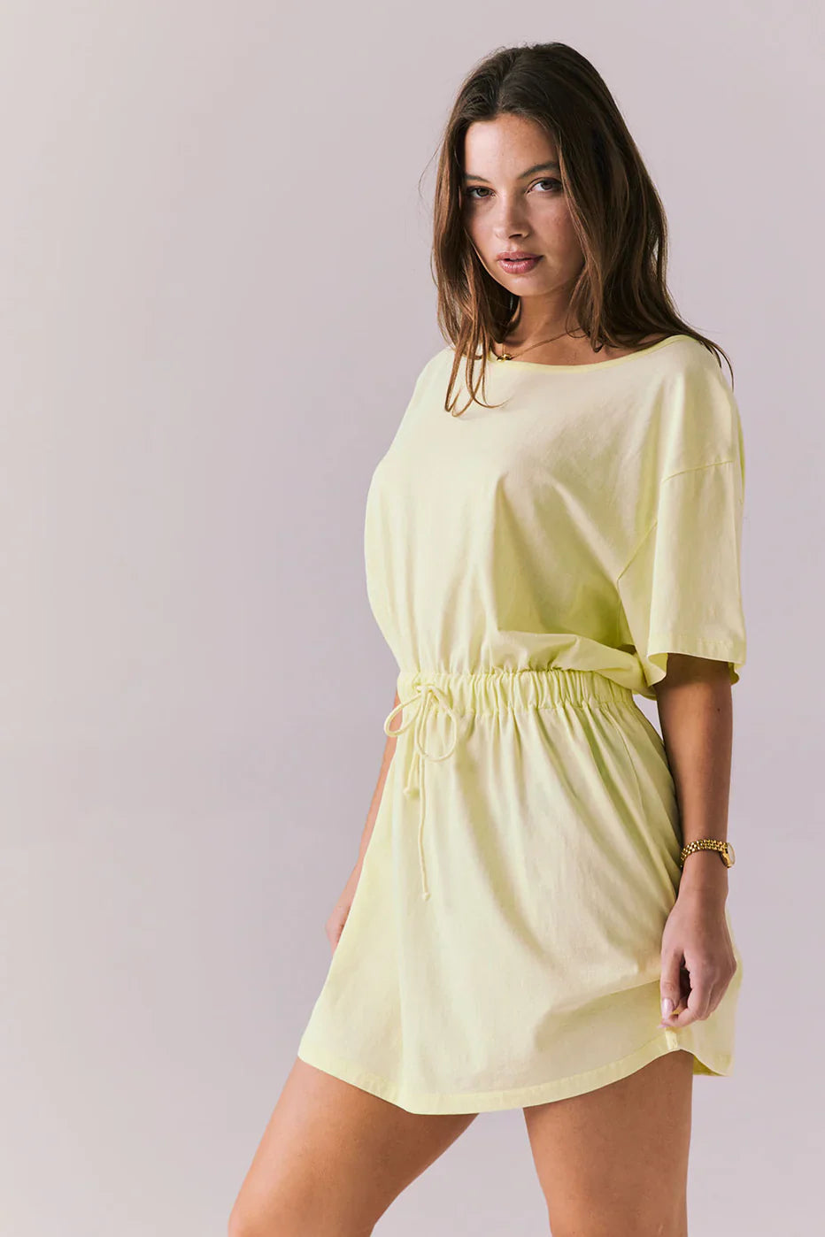 Inspired by 90s aerobics styles, this soft Panna Cotta t-shirt dress features a pull tie at the waist for a fun and playful look.