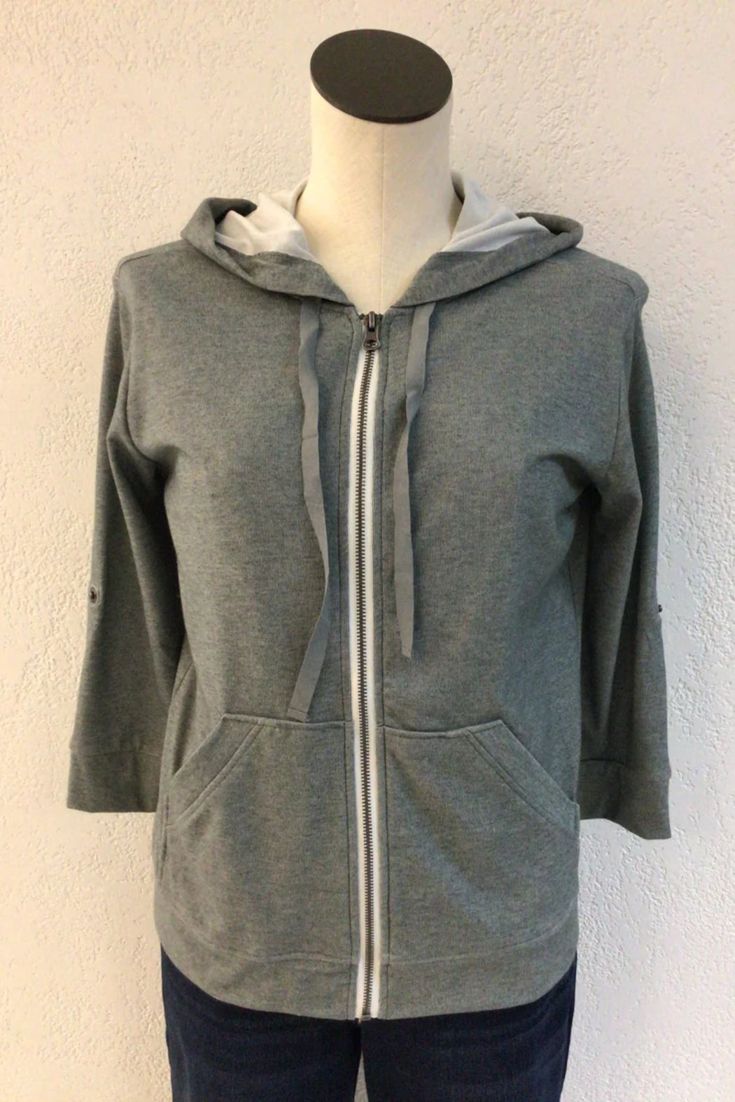 Zip Front Hoodie in Heather Grey Kangaroo Pockets Contrast Zipper in Cream Tab Sleeve
