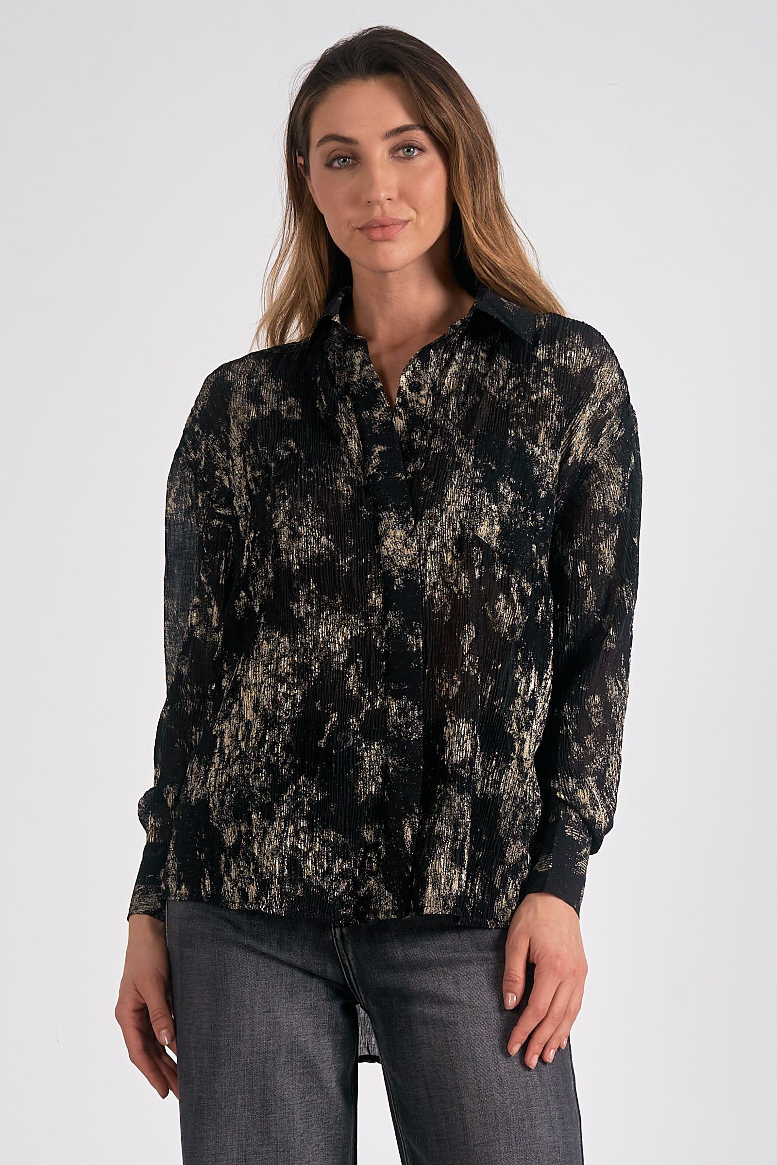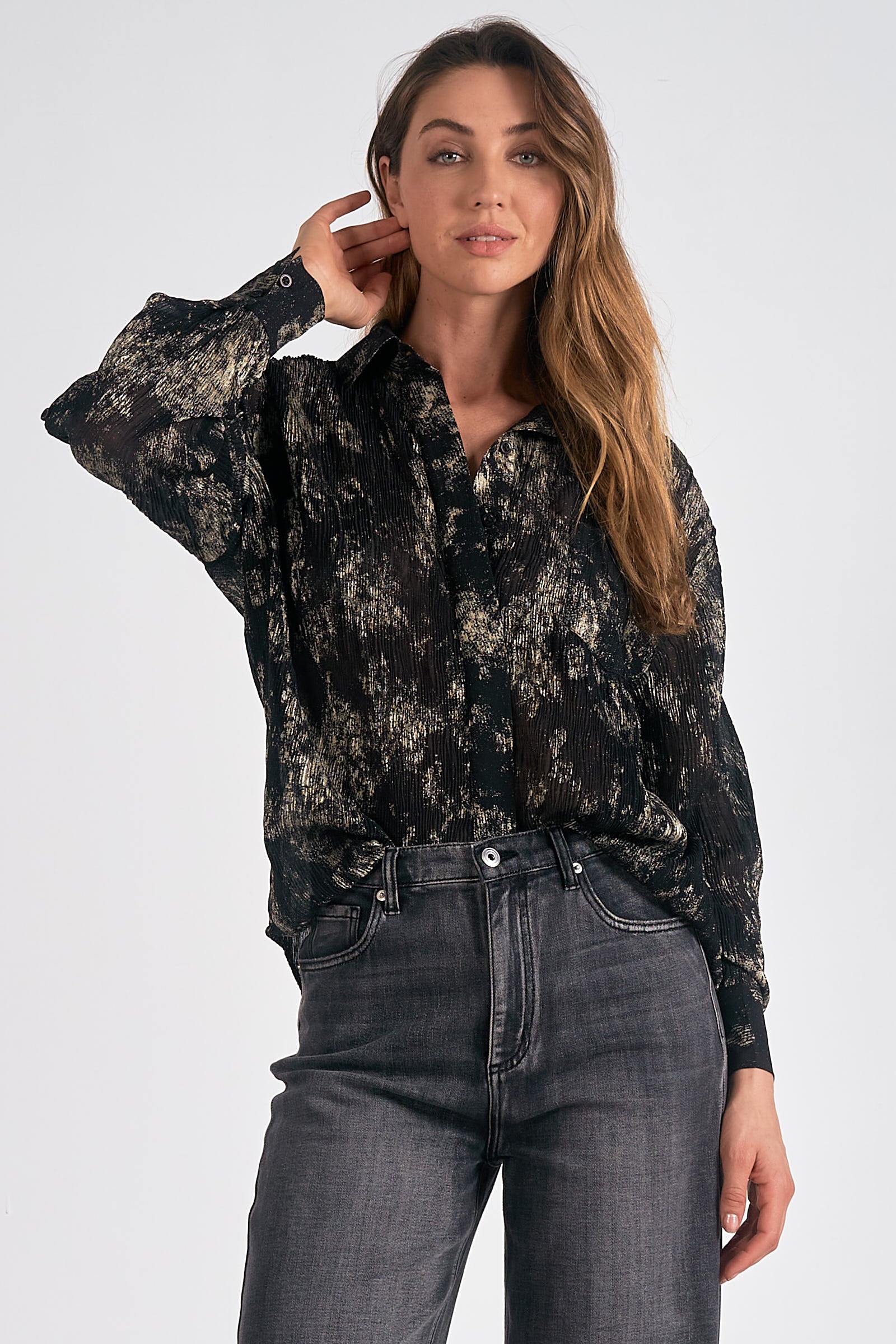 The Long Sleeve Gold Smudge Blouse features a color neckline and long full sleeves with a buttoned cuff. This sheer blouse also features a covered button down front closure. Pairs well with jeans, slacks or a skirt.