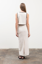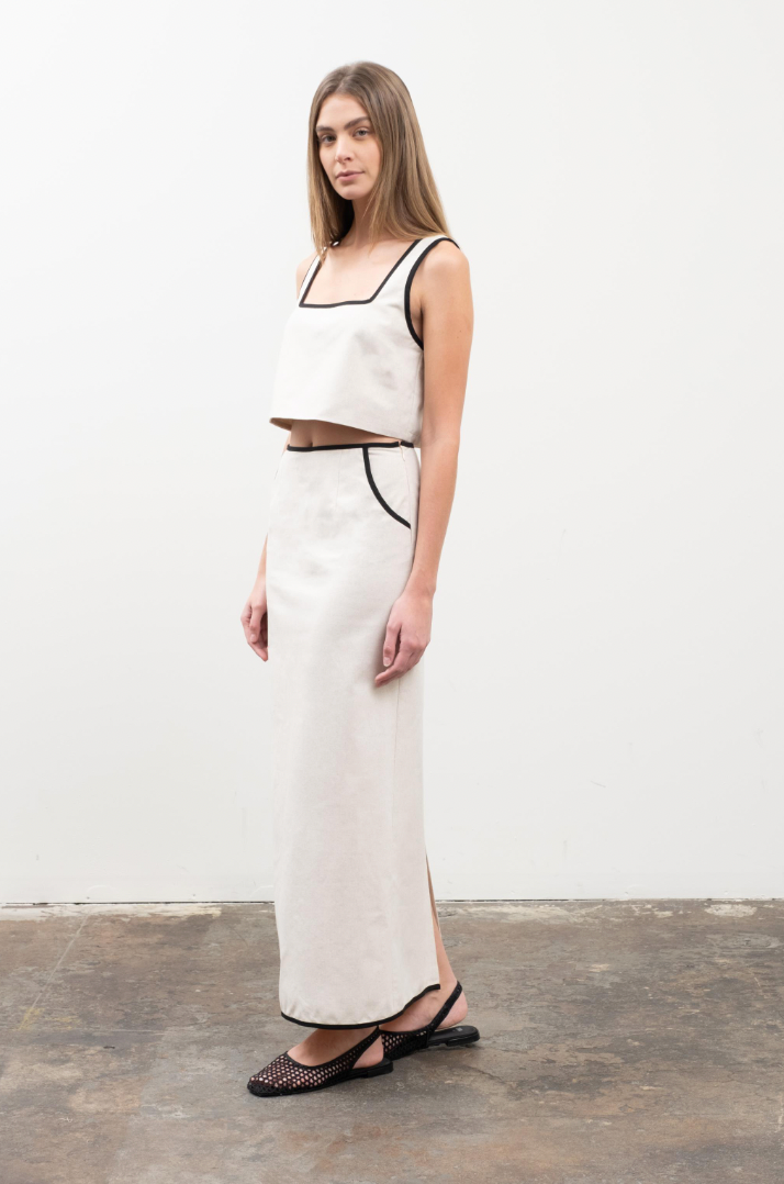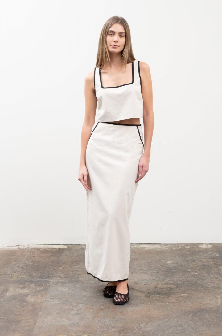 This chic crop top features a square neckline and wide straps, accented with contrasting black piping for a modern touch. Its tailored fit pairs perfectly with high-waisted bottoms, making it an ideal choice for stylish layering.