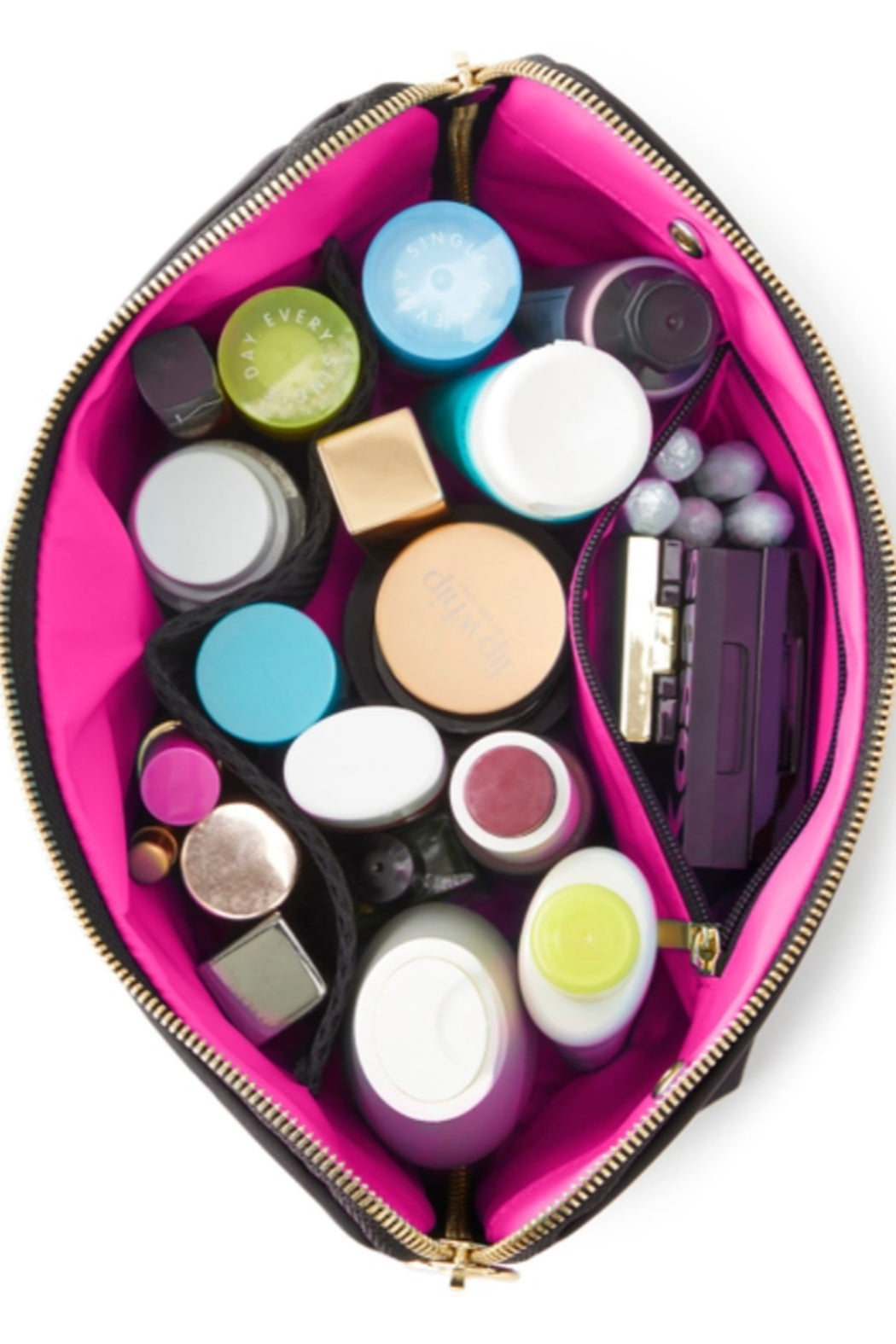 Finally a makeup bag that not only stores and protect your makeup, but has pockets made for your beauty blender, eyelash curler, and more. This makeup bag with compartments opens on 3 sides to easily access and see all of your makeup. Perfect size for a medium makeup collection or long weekend away.