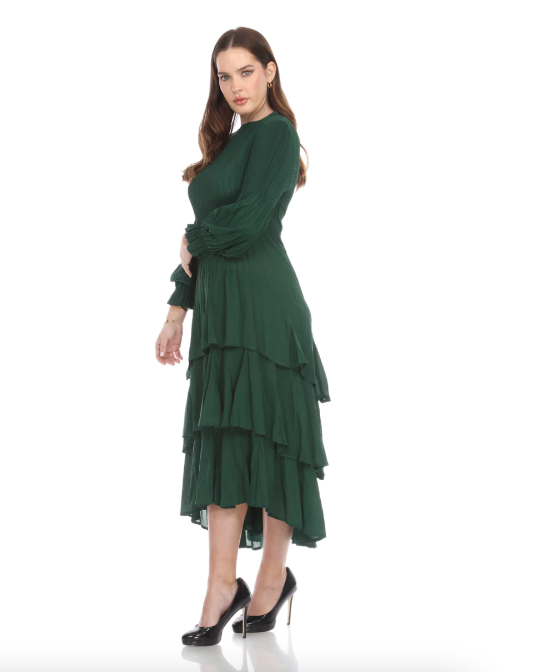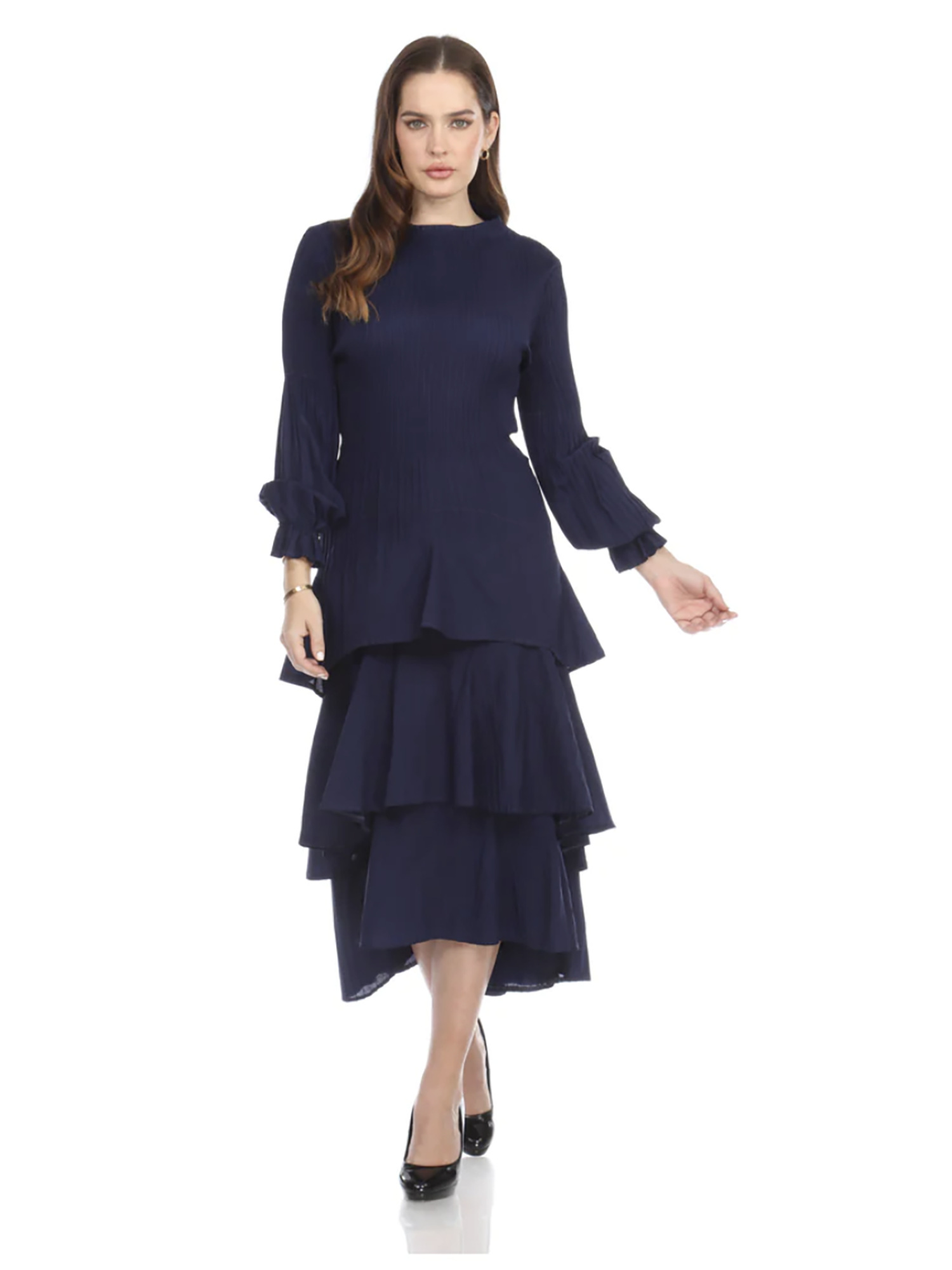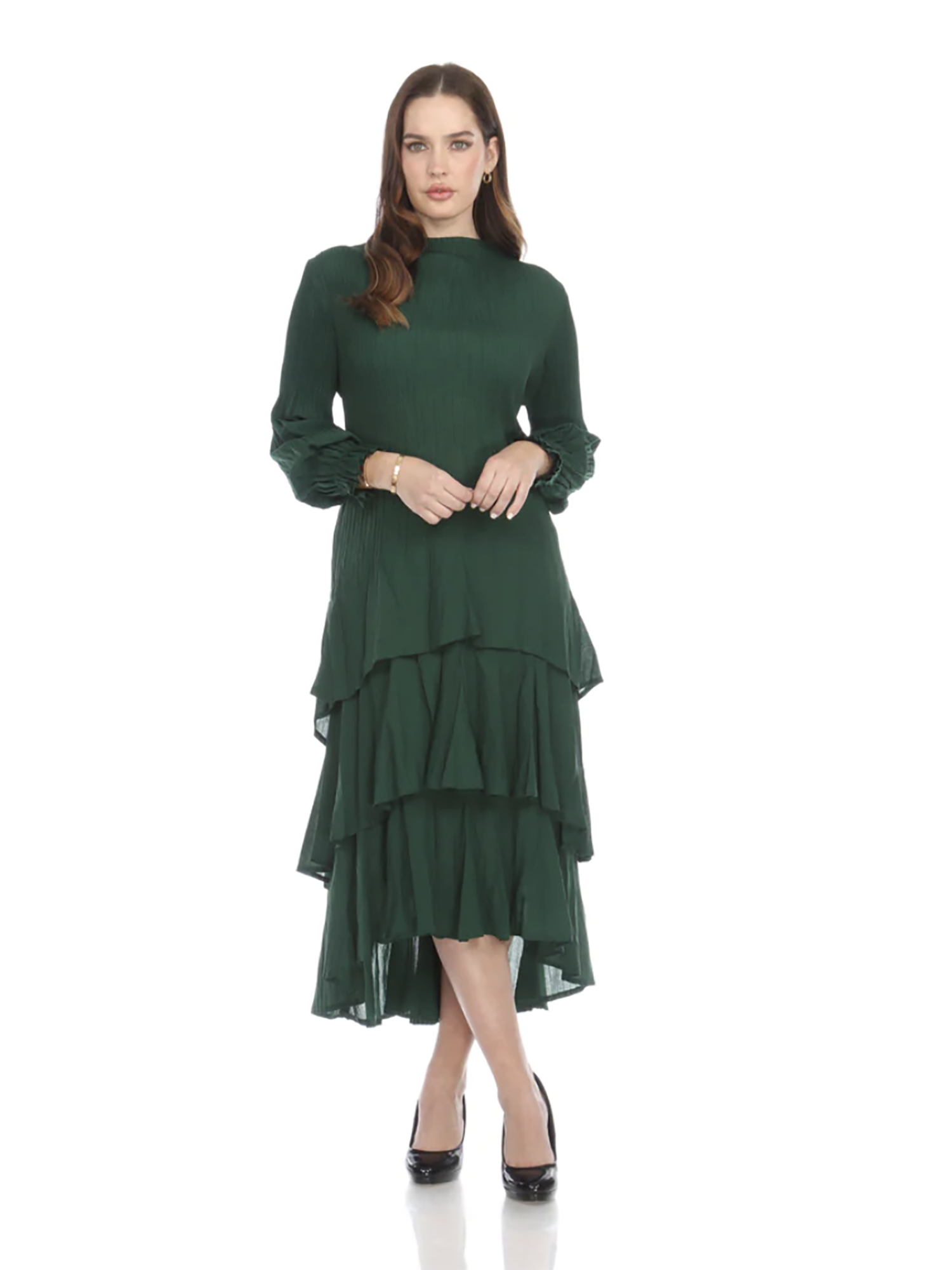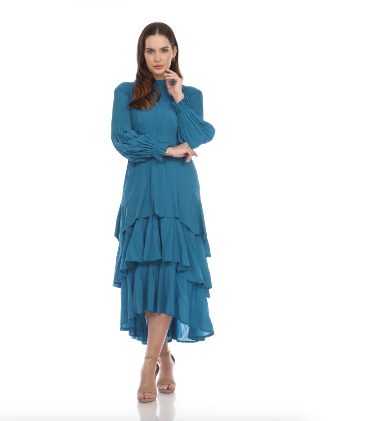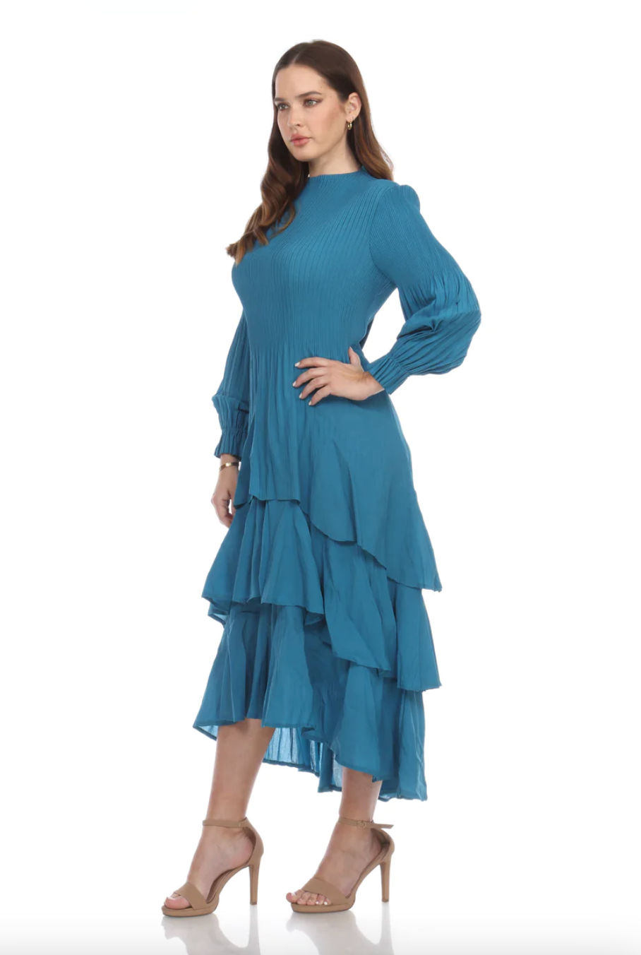 •LOOK: Veeca has done it again. We refer to this as the miracle dress. Once you put it on, you will understand. They use a unique technique with micropleating that enhances the fit of this dress. This version of the dress has a pull on style and high neckline. The long sleeves are also pleated and finish with a delicate ruffle. There are layers of ruffles that move and groove so gracefully with you. This dress is maxi length and the pleats gently open up as the layers cascade down. If you are familiar with the brand Veeca, here's one to add to your collection. Maybe stretch your limits a bit and try a different color. If you have never tried this brand before, there is no better time than the present for your next special occasion. This dress is a wonderful design and fit, created with just you in mind.