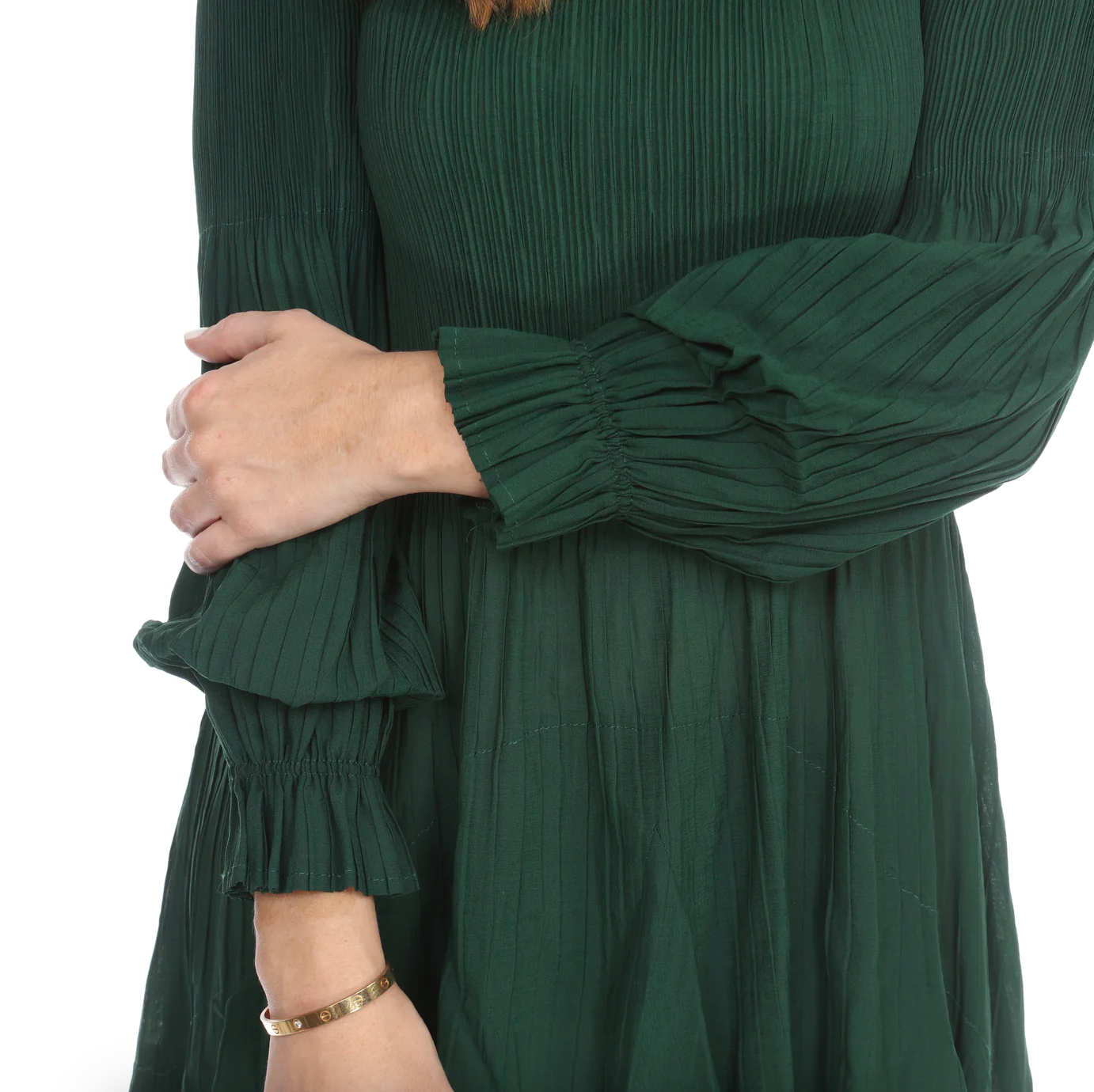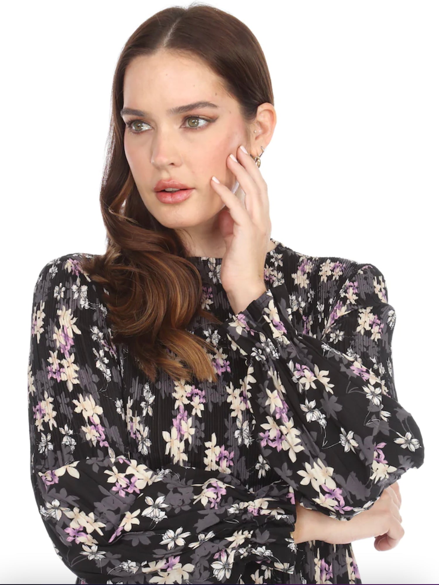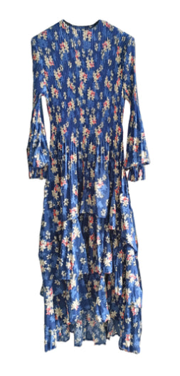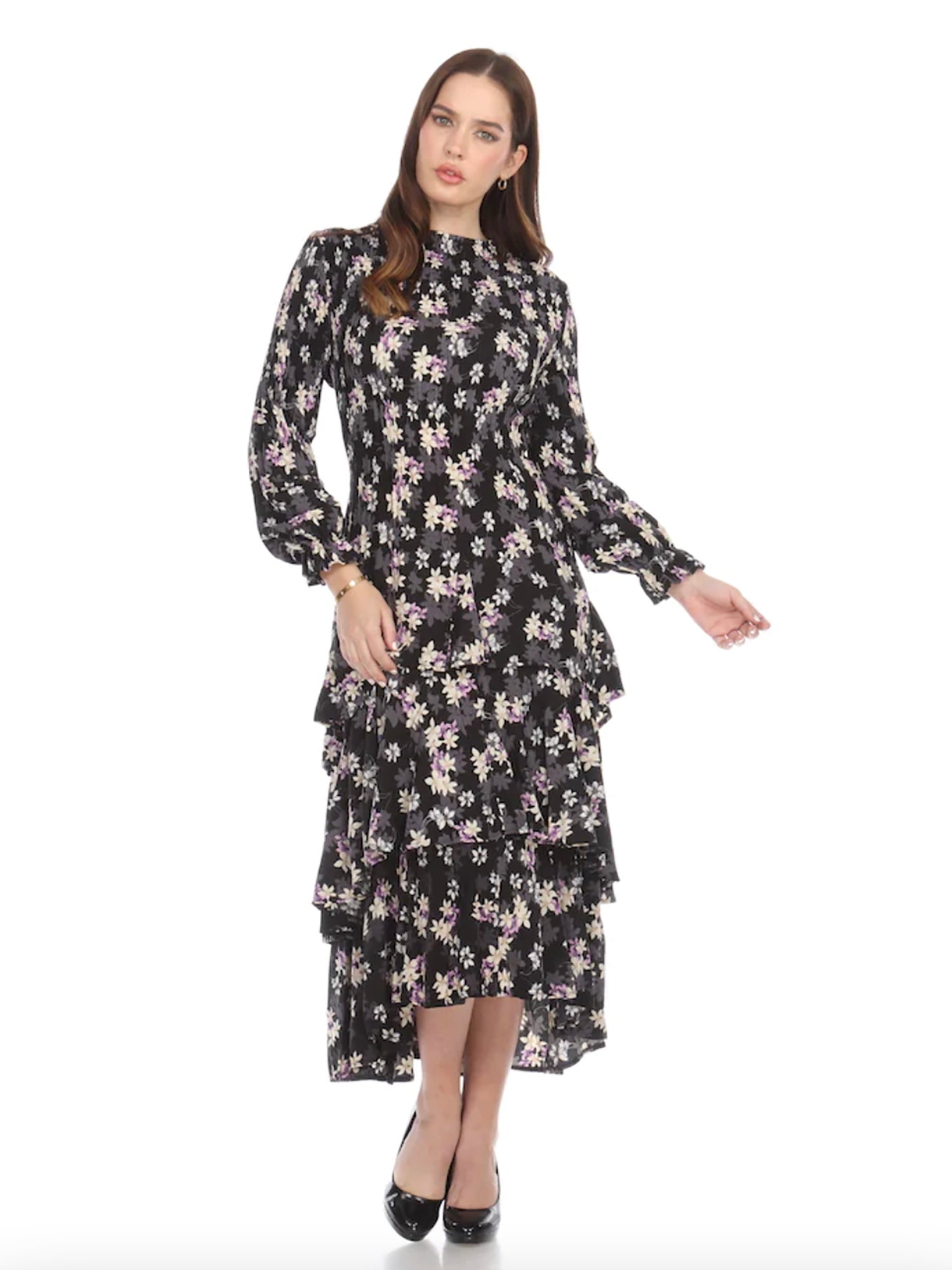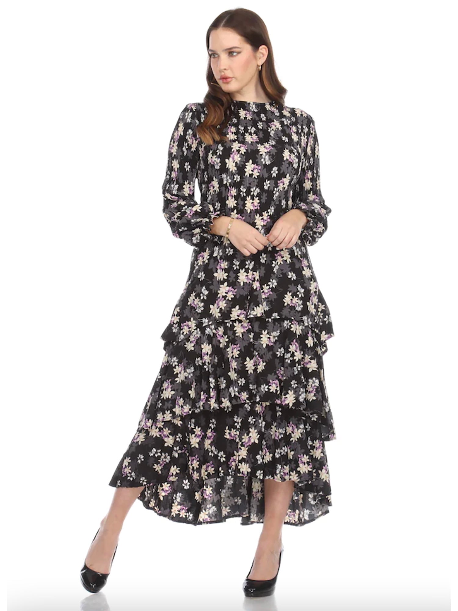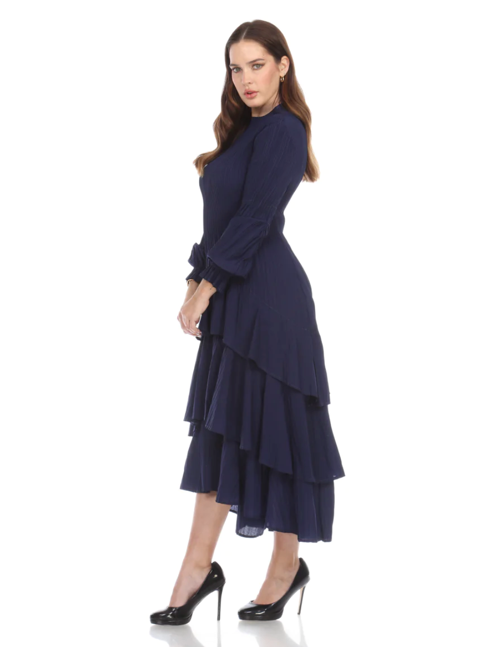 •LOOK: Veeca has done it again. We refer to this as the miracle dress. Once you put it on, you will understand. They use a unique technique with micropleating that enhances the fit of this dress. This version of the dress has a pull on style and high neckline. The long sleeves are also pleated and finish with a delicate ruffle. There are layers of ruffles that move and groove so gracefully with you. This dress is maxi length and the pleats gently open up as the layers cascade down. If you are familiar with the brand Veeca, here's one to add to your collection. Maybe stretch your limits a bit and try a different color. If you have never tried this brand before, there is no better time than the present for your next special occasion. This dress is a wonderful design and fit, created with just you in mind.
