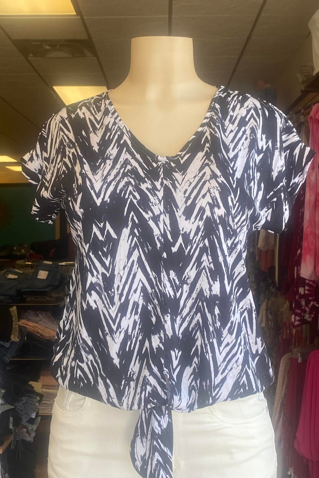 This printed top features a v neck line, short sleeves, a front tie and elastic around the bottom. Pairs great with jeans or white pants.