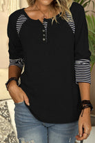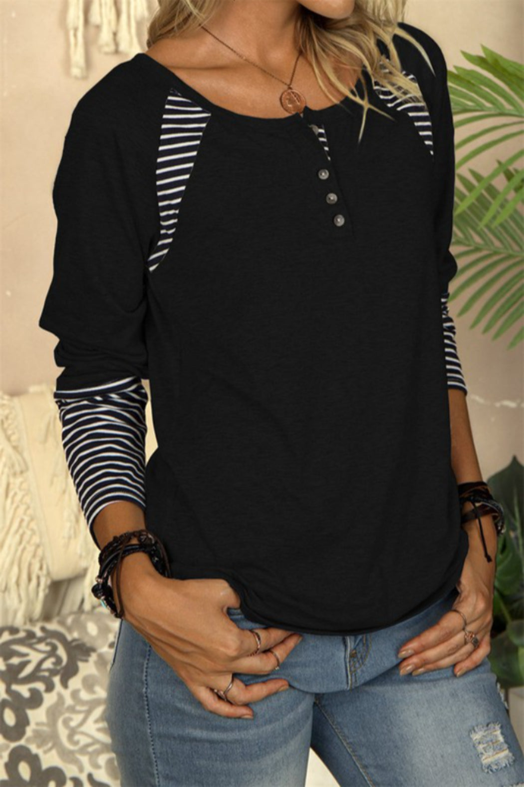 This long sleeve striped color block top features a crew neck line and buttons down the front.